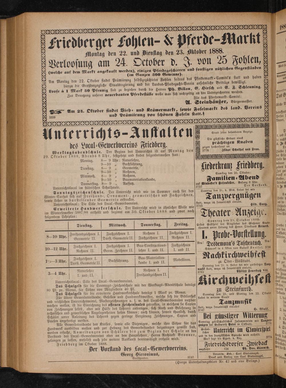SAC eee eee 8 7 2 Friedberger Fohlen-& Pfe rde-Markt 8 8 7 98— 0 8 Montag den 22. und Bienstag den 23. Oktober 1888. 5 Verloof 24. Octob J 25 Fohl Verloosung am 24. October d. J. bon Fohlen, 3 (welche auf dem Markt angekauft werden), einigen Pferdegeschirren und sonstigen nützlichen Gegenständen Wird 8 N(im Ganzen 300 Gewinne). 2 Am Montag den 22. Oktober findet Prämiirung selbstgezüchteter Fohlen seitens des Pferdemarkt-Comité's statt und haben S Anon 2 bierzu die Großherzogliche Staatsregierung und der Landes⸗Pferdezucht-Verein ansehnliche Beiträge bewilligt. 88— 8 Loose à 1 Mark 50 Pfennig sind zu beziehen durch die Herren Ph. Billau, E. Hirsch und C. F. Schleuning. 4 1 8 Zur Benutzung unserer neuerbauten Pferdeställe wolle man sich rechtzeitig an den Unterzeichneten wenden. 1 betreffe 2 Für das Pferdemarkt-Comité: 2 Das 0 8 A. Steinhäußer, Bürgermeister. 8 1 2 Am 24. Oktober findet Sieh und Krämermarkt, sowie Faselmarkt des land. Vereins 8 sülche 2 3339 und Prämiirung von schönen Faseln statt. 2 cee 2 2 8 8 35 8 NN 4 1 2 erson J 8 a, 1. WS 1 1 N 1 1 n* a eee eee, 8 n 1 E I 5 Statt jeder besonderen Anzeige. D 5 N 5 9 3 5 4 8 Die glückliche Geburt eines b. und g des Local-Gewerbvereins Friedberg. vrachtigen Knaben 4.0 g Werktagsabendschule. Der Beginn des Unterrichts ist auf Montag den 3776 enn 14 29. Oktober 1888, Abends 8 Uhr, festgesetzt und findet folgendermaßen statt: 25 1 Serbe Montag, 8— 9 Uhr: Naturlehre, eee 3 1„ Buchführung, 9 N heile be ienstag, 8—„ Geometrie, 0 b 5 männer e de Liederkranz Friedberg. Mittwoch, 21„ Rechnen, 5 Samstag den 20. Oktober: Zeit zwi I Familien- Abend Unterrichtslocal im städtischen Schulhause. 3 Felsenkeller. e 8 1195 5 Erleubad Sonntags zeichenschule. Der Unterricht wird wie im Sommer auch für den] Sonntag den 21. d. Mis 0 n Winter⸗Cursus sich auf Freihand⸗, Ornament-, geometrisches und Fachzeichnen 5 1 2* sowie Lehre in darstellender Geometrie erstrecken. N 5 Tanzvergnügen 14 An Unterrichtslocal: Die Säle des Local-Gewerbvereins. datt, wozu ich freundlichst einkade abe h Erweiterte Handwerkerschule. Der Unterricht wird in ähnlicher Weise wie 9763 ud. Sea: gen 2 b 1887/88 ertheilt und beginnt am 30. Oktober 1888 und zwar nach 6 ea er U ei* 12 0 olgendem Lehrplan: Th ˖ 5 A 5 ge Horsadt, 5— J ⁰y 5 e. O We 1 5 Sonntag den 21. Oetobe 1888: Dienstag. Mittwoch. Donnerstag. Freitag. Erstes Halse e Mitglieder des Wieß e Stute, 5 2 e 5 ee, e 28 5 theaters unter Leitung des Herrn Direktors Reiners. e l 8-10 Uhr. i ö Fachz 0 Rechnen I. Fachzeichnen I. e den Geometrie II. Darst. Geometrie II. Fachzeichnen II. Rechnen II. 0 Probe- Vorstellung. 117 . Mörlen, 10-12 Uhr. Fachzeichnen I. Fachzeichnen I. Bau-Constructions⸗] Fachzeichnen Neu! Desdemona's Taschentuch. Neu! S Rechnen II. Geom. Zeichnen II. lehre J. und II. I. und II. Schwank in 4 Akten von Rudolf Knetsel. 3738 1% Uhr. Facheicnen l. Buchft Dan Materialen. dell Nachkirchweihfest Darst. G 4 uchführung. Modelliren. f arst. Geometrie II. kunde I. und II. 0 zu Ober-Wöllstadt. hit 15 5 17 1 f Sonntag den 21. d. findet bei mir gutb 4 34 Ute. 7 555 Rechnen J. ge f., een ich bg N esehe 155 Na un ö Freihandzeichnen II. j e een, 0 nassenen n Säle des Local-Gewerbvereins. 21 2 1 Das Schulgeld für die Sonntags-Zeichenschule mit der Werktags— rä ir met U E dus ei f 80 Pf. pr. Monat, für Söhne von Mitgliedern 19 Pf. N j ba Das Schulgeld für die erweiterte Handwerkerschule beträgt 1 Mark pr. Monat. zu Steinfurth. andere Für ältere Gewerbetreibende, Gesellen und Handwerksmeister, welche sich die Bibliothek Sonntag den 21. und Montag den 22. Ottetee mude und reichlichen Unterrichtsmittel, Musterzeichnungen u. s. w. des Local⸗Gewerbvereins nutzbar findet in meinem Saale 1 ee e e e bie e getroffen, in welchem sie Copien Tanzmusik 1 f„oder mit Hülfe es Lehrers anfertigen, sich R i i technischen und gewerblichen Angelegenheiten holen 11 75 5 1 Poet chu 28 e H. Wolf. 2 0 Schüler unter Anleitung des Lehrers gegen geringe Vergütung Zeichnungen, Co ien und j f f f 5 Pausen angefertigt werden. 4 Bei Züustiger Witterung 1 Alle Gewerbetreibende des Kreises, sowie alle Diejenigen, welche ihre Söhne für das Sonntag gesellschaftliches Zusammensein mit Tanzbete 3. 0 e 1 5 und zur Hebung des Gewerbestandes beizutragen gewillt sind dungen ber Gee eee ee 1 N ersucht, Anmeldungen von Schülern bis 5 Gründ⸗ f g 7 i 4. O. e 135 e ele en f oder 35 den Saupe Achten ber lic Unterricht 0 Clavierspiel 00 gelangen zu lassen, wo elbst auch jed it. 1 N 5„und in der französischen Sprache wird ertheilt. 6 1 1 5 0 2 85 weitere Auskunft bereitwilligst ertheilt wird. ternch eder A dach ; riedrichsdorfer Zwieba f Der eee e. empfehlt 124 f% 0 aianig. he ieronimus, Verantw. Ned.; Carl B Vorsitzender. 3747 Nun a 2 N a g (Hierzu Unterhaltungsblatt Nr. 42 und eine Beilage.) 105