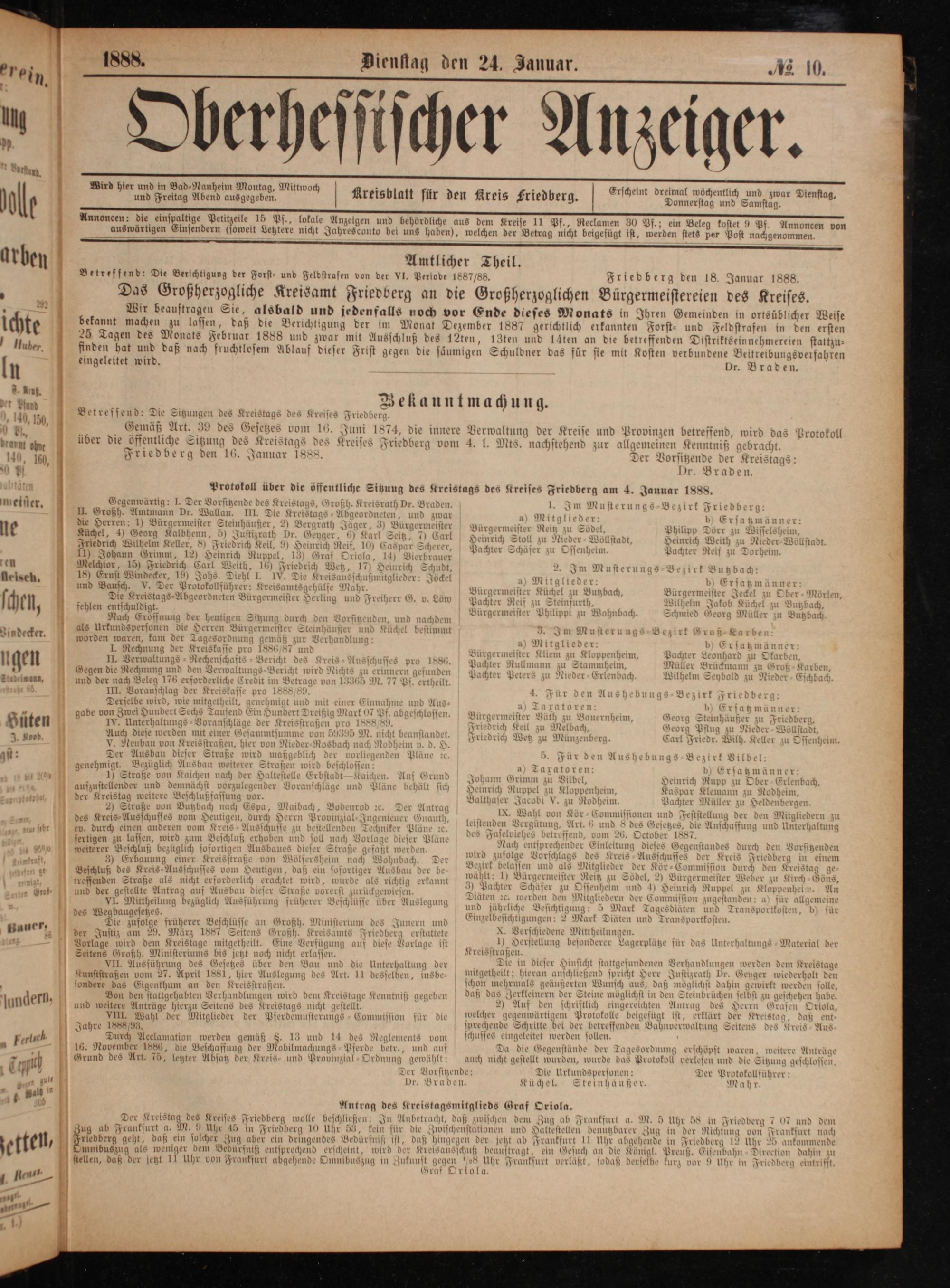 über die öffentliche Sitzung des Kreistags de Friedberg den 16. Januar 1888.