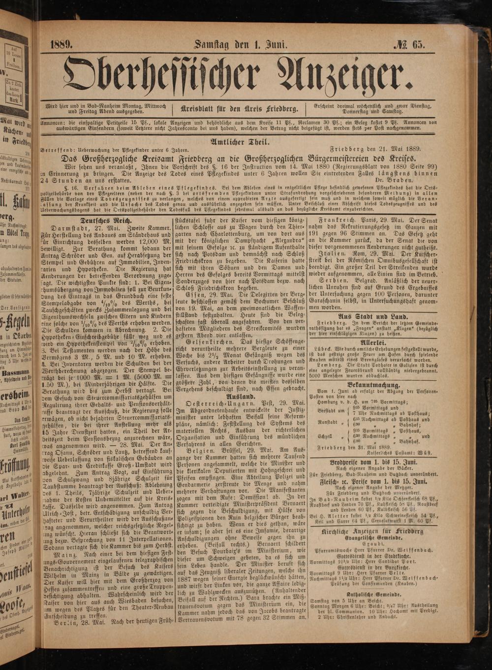 Friedberg den 31. Mai 1889. Kaiserliches Postamt: Wüst.