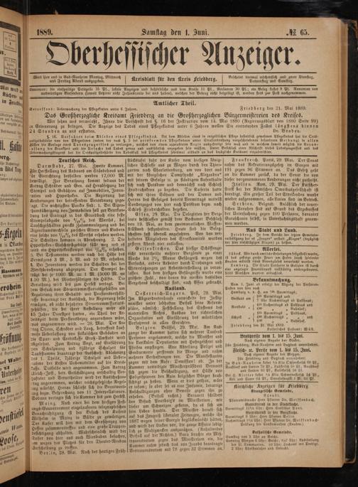 Kirchliche Anzeigen für Friedberg Ebangelische Gemeinde. Exaudi. Pfarramtswoche Herr Pfarrer Dr. Weiffenbach. Gottesdienst in der Stadtkirche. Vormittags 10½, Uhr: Herr Candidat Port. Gottesdienst in der Burgkirche—