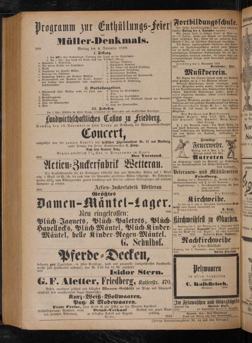 Montag den 4. Nov. l. J., 4 N Mittags präeis ½1 Uhr, 9 5 65 Antreten am Kirchenplatz(nächst der Windeck) zur Bethelligung 5 an der Enthüllungsfeier des Müller-Denkmals. Duernation C Ji Veteranen- und Militärverein Friedberg. Samstag den 2. November d. I., Abends 81 Uh Generalversammlung nach§. 31 der Statuten. 5 g Tages ordnung: J. Enklastungsertheilung für Rech⸗ nung pro 1888. 2. Weihnachtsfeter.