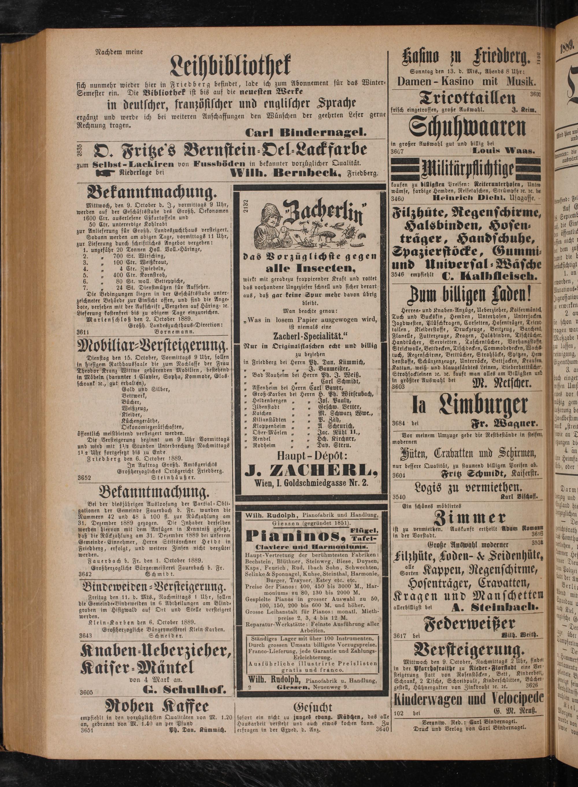 Kleider, Küchengeräthe, Oekonomiegerätschaften, öffentlich meistbietend versteigert werden. Die Versteigerung beginnt um 9 Uhr Vormittags und wird mit 1½½ Stunden Unterbrechung Nachmittags 112 Uhr fortgesetzt bis zu Ende Friedberg den 6. October 1889. In Auftrag Großh. Amtsgerichts Großherzogliches Ortsgericht Friedberg. 3652 Steinhäußer.
