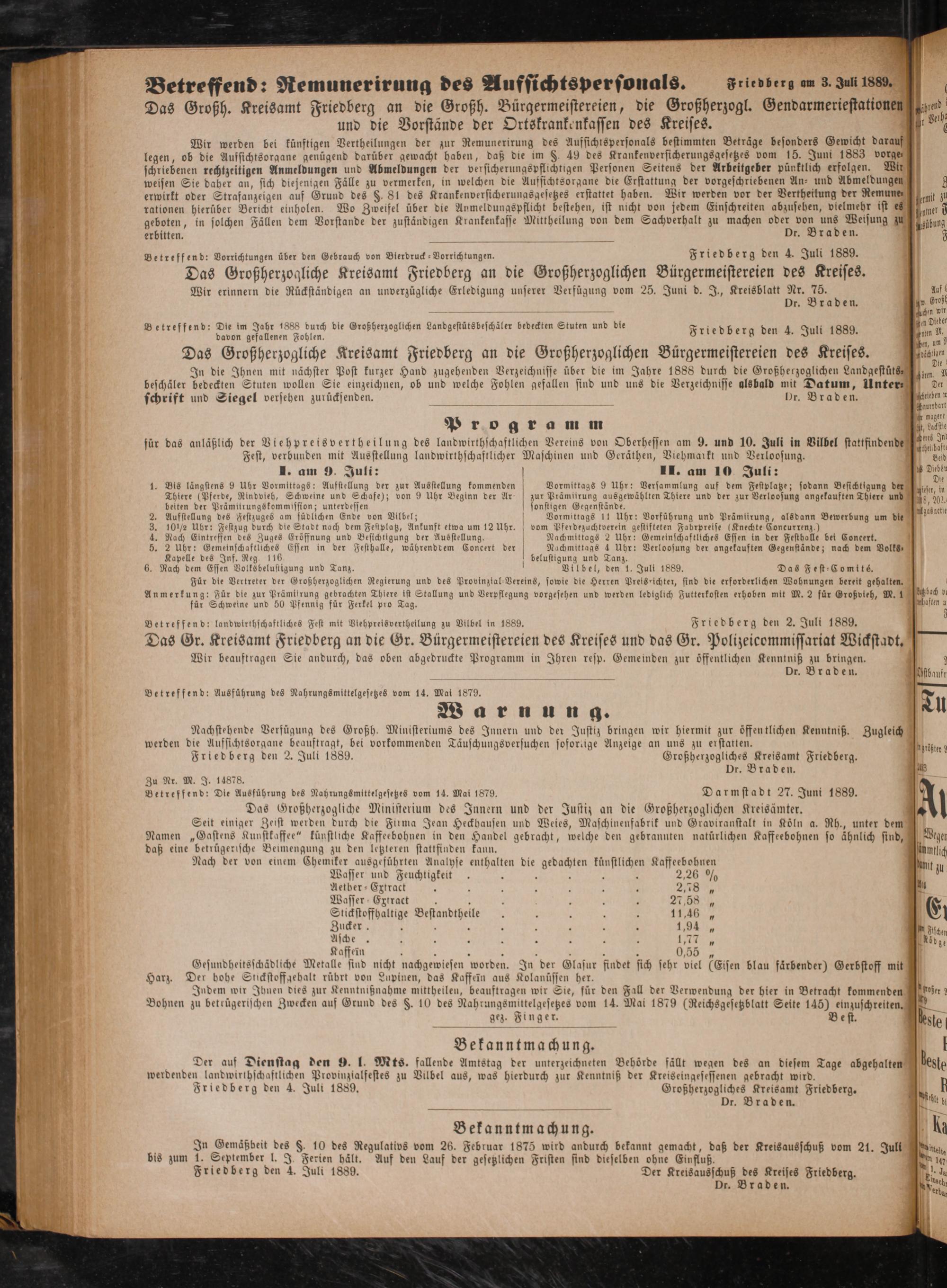 0 Warnung. Tu Nachstehende Verfügung des Großh. Ministeriums des Innern und der Justiz bringen wir hiermit zur öffentlichen Kenntniß. Zugleich werden die Aufsichtsorgane beauftragt, bei vorkommenden Täuschungsversuchen sofortige Anzeige an uns zu erstatten. 5 a Friedberg den 2. Juli 1889. Großherzogliches Kreisamt Friedberg. i Dr. Braden. 1 Zu Nr. M. J. 14878. 1 Betreffend: Die Ausführung des Nahrungsmittelgesetzes vom 14. Mai 1879. Darmstadt 27. Juni 1889. Das Großherzogliche Ministerium des Innern und der Justiz an die Großherzoglichen Kreisämter. 1 Seit einiger Zeist werden durch die Firma Jean Heckhausen und Weies, Maschinenfabrik und Graviranstalt in Köln a. Rh., unter dem Namen„Gastens Kunstkaffee“ künstliche Kaffeebohnen in den Handel gebracht, welche den gebrannten natürlichen Kaffeebohnen so ähnlich sind, Vage daß eine betrügerische Beimengung zu den letzteren stattfinden kann.: siamllic Nach der von einem Chemiker ausgeführten Analyse enthalten die gedachten künstlichen Kaffeebohnen 5 11 1 Wasser und Feuchtigkeit i g N 0 J Aetber-Extract... l 5 N Wasser Extract g 5 5 5. 1 8 Stickstoffhaltige Bestandtheile. 5. 8 g f E; Zucker f 5 8 1* N 0 2 0 a 0 0 Zischen Asche. a a 8 a 5. Ridge Kaffein. 5 0 Gesundheitsschädliche Metalle sind nicht nachger iel(Eisen blau faͤrbender) Gerbstoff mit 0 Harz. Der bohe Stickstoffgehalt rübrt von Lupinen, das Kaffefn aus Kolanüssen her. Indem wir Ihnen dies zur Kenntnißnahme mittheilen, beauftragen wir Sie, für den Fall der Verwendung der hier in Betracht kommenden eher! Bohnen zu bettügerischen Zwecken auf Grund des F. 10 des Nah rungsmittelgesetzes vom 14. Mai 1879(Reichsgesetzblatt Seite 145) einzuschreiten.