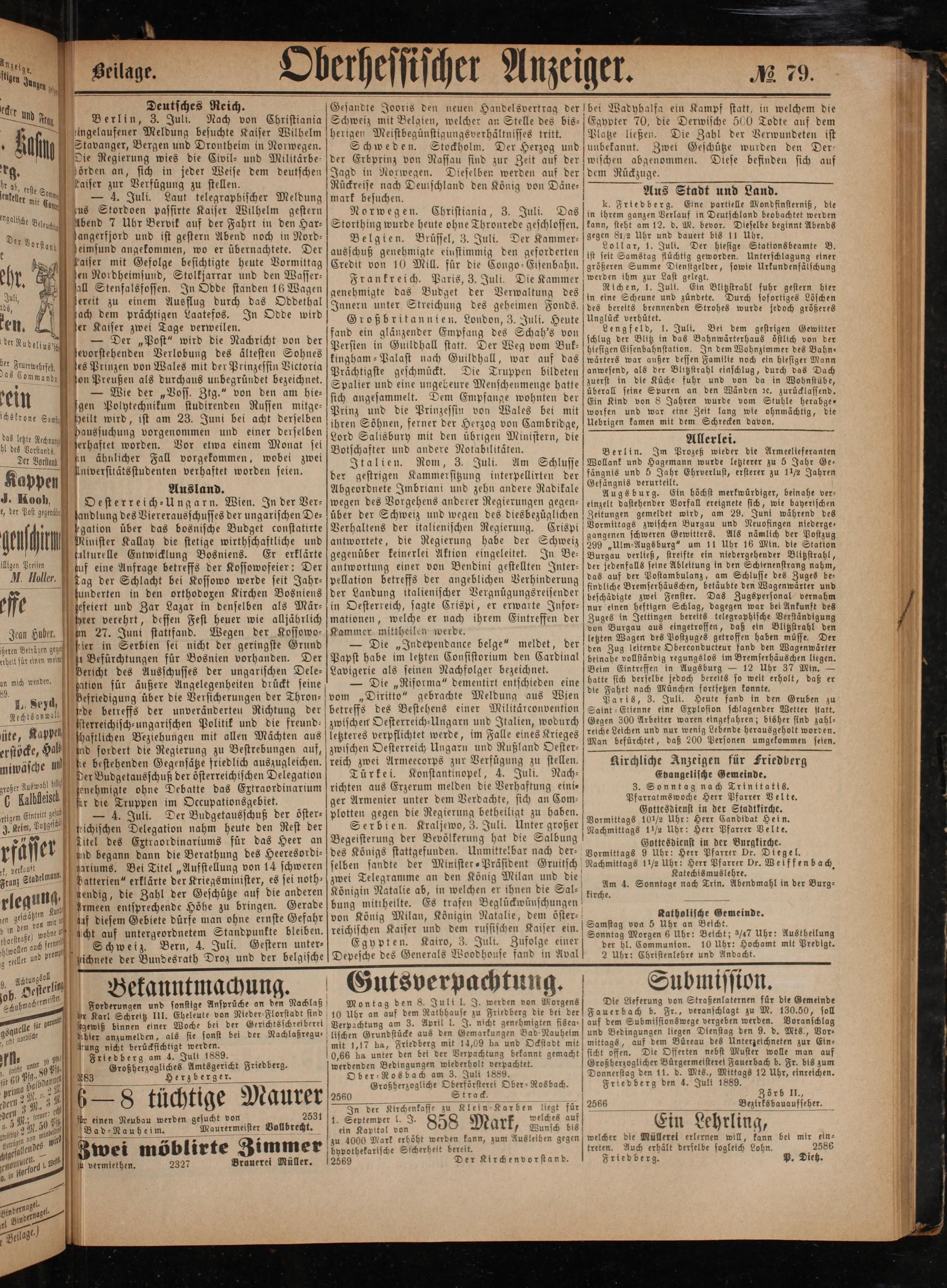 Gesandte Jooris den neuen Handelsvertrag der Schweiz mit Belgien, welcher an Stelle des bis— herigen Meistbegünstigungsverhältnisses tritt. Schweden. Stockholm. Der Herzog und der Erbprinz von Nassau sind zur Zeit auf der Jagd in Norwegen. Dieselben werden auf der Rückreise nach Deutschland den König von Däne— mark besuchen. Norwegen. Christiania, 3. Juli. Das Storthing wurde heute ohne Thronrede geschlossen. Belgien. Brüssel, 3. Juli. Der Kammer— ausschuß genehmigte einstimmig den geforderten Credit von 10 Mill. für die Congo-Eisenbahn. Frankreich. Paris, 3. Juli. Die Kammer genehmigte das Budget der Verwaltung des Innern unter Streichung des geheimen Fonds. Großbritannien. London, 3. Juli. Heute fand ein glänzender Empfang des Schah's von Persien in Guildhall statt. Der Weg vom Buk— kingham-Palast nach Guildhall, war auf das Prächtigste geschmückt. Die Truppen bildeten Spalier und eine ungeheure Menschenmenge hatte sich angesammelt. Dem Empfange wohnten der Prinz und die Prinzessin von Wales bei mit ihren Söhnen, ferner der Herzog von Cambridge, Lord Salisbury mit den übrigen Ministern, die Botschafter und andere Notabilitäten. Italien. Rom, 3. Juli. Am Schlusse der gestrigen Kammersitzung interpellirten der Abgeordnete Imbriani und zehn andere Radikale wegen des Vorgehens anderer Regierungen gegen— über der Schweiz und wegen des diesbezüglichen Verhaltens der italienischen Regierung. Crispi antwortete, die Regierung habe der Schweiz gegenüber keinerlei Aktion eingeleitet. In Be— antwortung einer von Bendini gestellten Inter— pellation betreffs der angeblichen Verhinderung der Landung italienischer Vergnügungsreisender in Oesterreich, sagte Crispi, er erwarte Infor— mationen, welche er nach ihrem Eintreffen der Kammer mittheilen werde. — Die„Independance belge“ meldet, der Papst habe im letzten Consistorium den Cardinal
