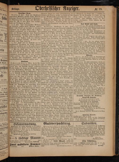 Montag den 8. Juli l. J. werden von Morgens 10 Uhr an auf dem Rathhause zu Friedberg die bei der Verpachtung am 3. April l. J. nicht genehmigten fisca⸗ lischen Grundstücke aus den Gemarkungen Bad Nauheim mit 1,17 ha, Friedberg mit 14,09 ha und Ockstadt mit 0,66 ha unter den bei der Verpachtung bekannt gemacht werdenden Bedingungen wiederholt verpachtet.