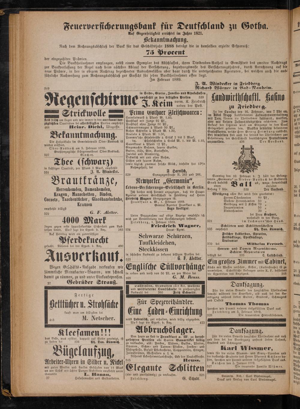 Unter Bezugnahme auf obige Anzeige empfehle ich mich zur Vermittelung von Versicherungen bestens. Friedberg, 1. Februar 1889. Friedrich Wagner, 534 Haupt⸗Agent.