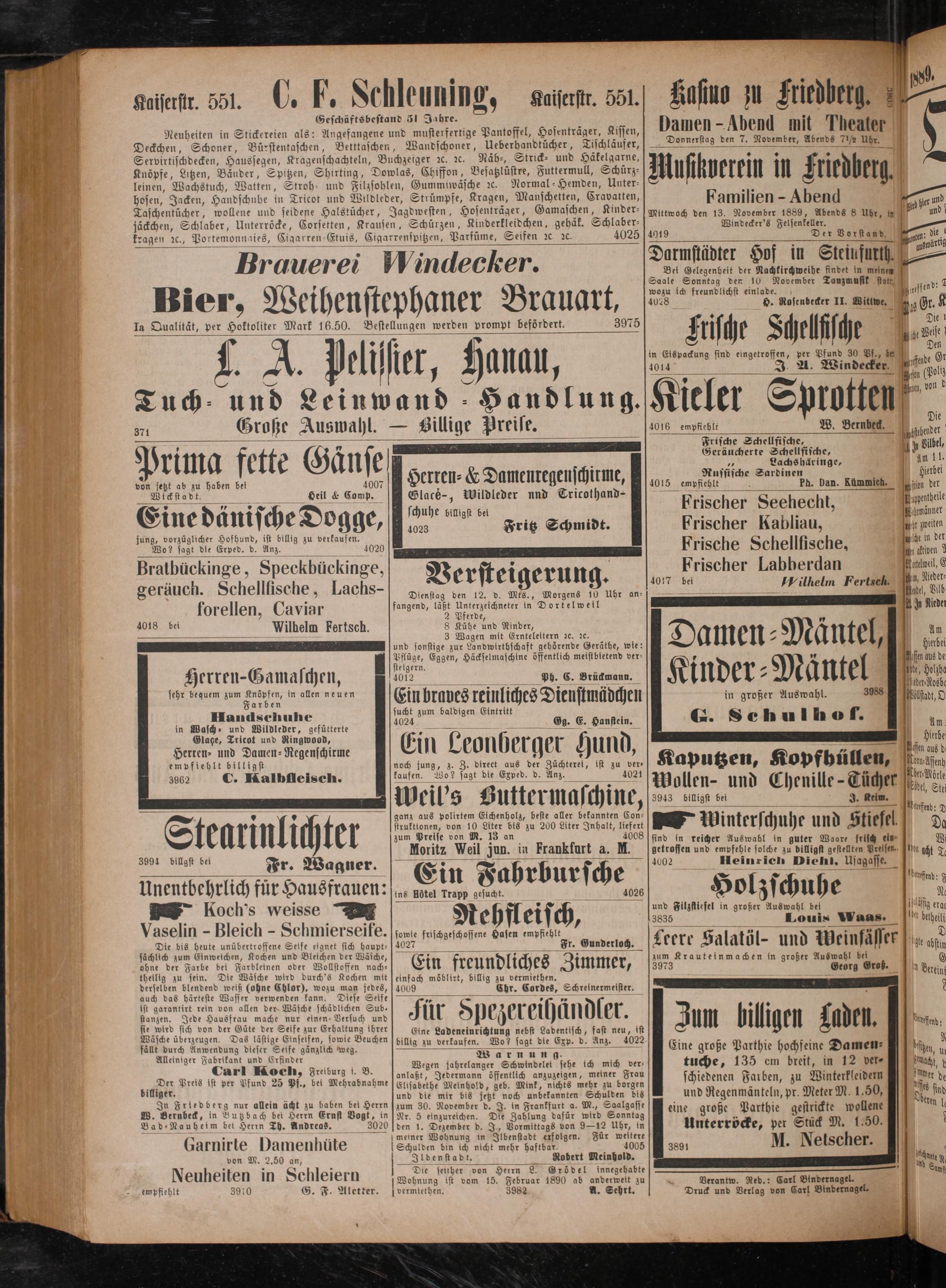 Mittwoch den 13. November 1889, Abends 8 Uhr, Windecker's Felsenkeller. 4019 Der Vorstand.