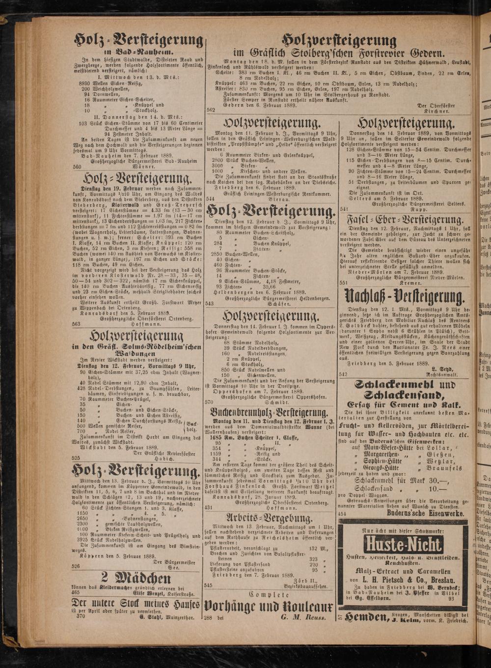 Astreiser: 830 rm Buchen, 95 rm Eichen, Erlen, 197 rm Nadelholz.„ Zusammenkunft: Morgens um 10 Uhr im Stolbergerhaus zu Ranstadt. 1 Förster Semper in Ranstadt ertheilt nähere Auskunft.
