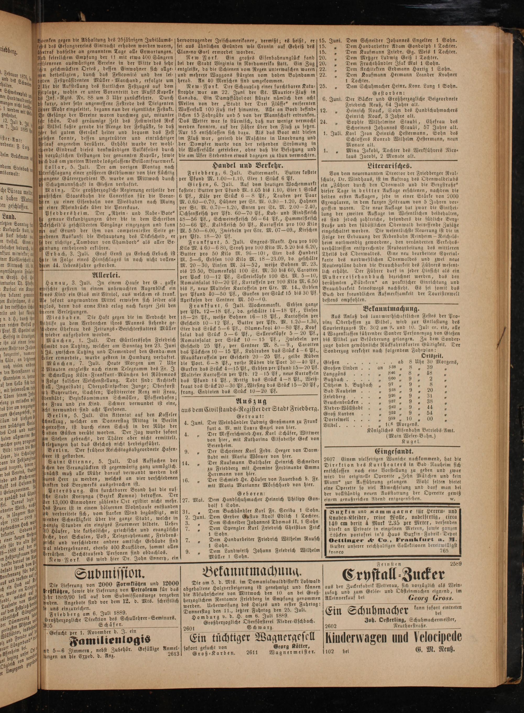 ö M. mit l von bier. e a Nation Güsten verübt worden. Der Zug wurde sofort 4 197 w e en Schäfer Wittwer Königliches Eisenbahn Betriebs Amt. aum alf In Stehen gebracht, der Thäter aber nicht ermittelt..“ 901 it Katharina Ellsabethe Geck von(Main Weser⸗Bahn.) anz prog 1 von hier, mit Kathar 0 4 i welcher g an die en hat das Geschoß nicht herbeigeführt. Belenheimn. Kugel. „Vlld! 1 ul Berlin. Der frühere Reichstagsabgeordnete Hasen⸗ g. Der Schreiner Karl Frdr. Heeger von Darm— Eingesandt 00 est ungsi 0 il gestorben. stadt mit Marta Wörner von hier. 2 5 5. 5 8 dann die er Saint Etienne, 5. Juli. Das Aufsuchen der Der Kaufmann Balthaser Heinrich Schneider 2607 Einem vielseltigen Wunsche nachkommend, hat die gets tragend, chen der Verunglückten ist gegenwärtig ganz unmöglich. 0 zu Friedberg mit Hermine Ferdinande Emma Direktton des Kurtheaters in Bad Nauheim sich er des 1 00 10 nächst muß alle Mühe darauf verwandt werden des Herrmann von hier. entschlossen noch 25 e und zwar inde⸗ und uers Herr zu werden, welches an vier verschiedenen Schmied Hr. 56 von Fauerbach b. Fr. wird die originelle Operette„Zehn Märchen 5 b dis Huscren“ Fenkten des Bergwerks ausgebrochen it N„ 5 5 1 Mann“ zur Aufführung gelangen. Wohl selten bietet U inen. 8. mit Marla Marianne Mörschhard von h 0 l 0 Gesangvetein pon Petersburg. Ein furchtbarer Brand hat die rus— eine Operette so viel Abwechselung und darf man bei . zunächs da sche Stadt Krekynga(Bezirk Kowno) betroffen. Der ee. 55 der vollständig neuen e, 1 Operette gewiß aral er 13 Einwohner zählende Ort existirt nicht mehr. l Dem Handschuhmacher Heinri ipp Gon- einem genußreschen Abend entgegenseben. W. be. 0 das 1 1 n 1 Wobnhause entstanden 2 8. z* 5 u 5 ertba 1 Sohn. g 7 in läng id verbreitete sich, vom starken Wind begünstigt, mit em Buchbändler Karl Fr. Dux ren und va aðνese für Perte- und 15 1860 len Aender Schnelliskeit über die ganze Start, welche in Dun Seen e ee N 1 Knaben⸗Kleider, reine Wolle, nadelfertig, circa Aahrachen hoh og Kanzig Stunden ein einziges Feuermeer bildete. Ueber. Dem Schneider Johannes Thomas 11 1 Sehn. 140 om breit 4 Mark 2.35 per Meter, versenden 90 elt. 2 Häuser, die katholische, griechische und evanglische] 7. Dem Spengler Karl Friedrich Christtan Frick direkt an Private in einzelnen Metern, sowie ganzen 1 5 kutzen oe Lerche, dret Schulen, Post, Telegraphenamt, Friedens- 1 Sohn. f. Stacken portofrei in's Haus Buxkin- Fabrik- Depot e für dle richt und verschiedene andere amtliche Gebäude sind J Dem Handarbeiter Friedrich Wilhelm Rausch Oettinger& Co., Frankfurt a. M. a1. 85 auf der e al niedergebrannt, ebenso 400 Kaufläden, sammt allen 1 Sohn. f Uuster unserer reichhaltigen Collekttonen bereitwilligst 75 r horräthen. Sechstausend Personen sind obdachlos. 0 5 765 ben. 1 9— N 1.. ein. F 4 a Vork..„. dankte da 9