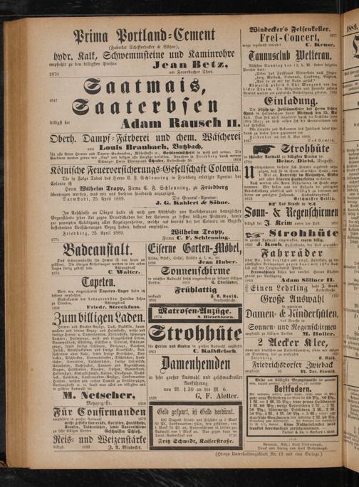 bestehenden Versicherungen Bezug haben, bestens Friedberg, 25. April 1889.