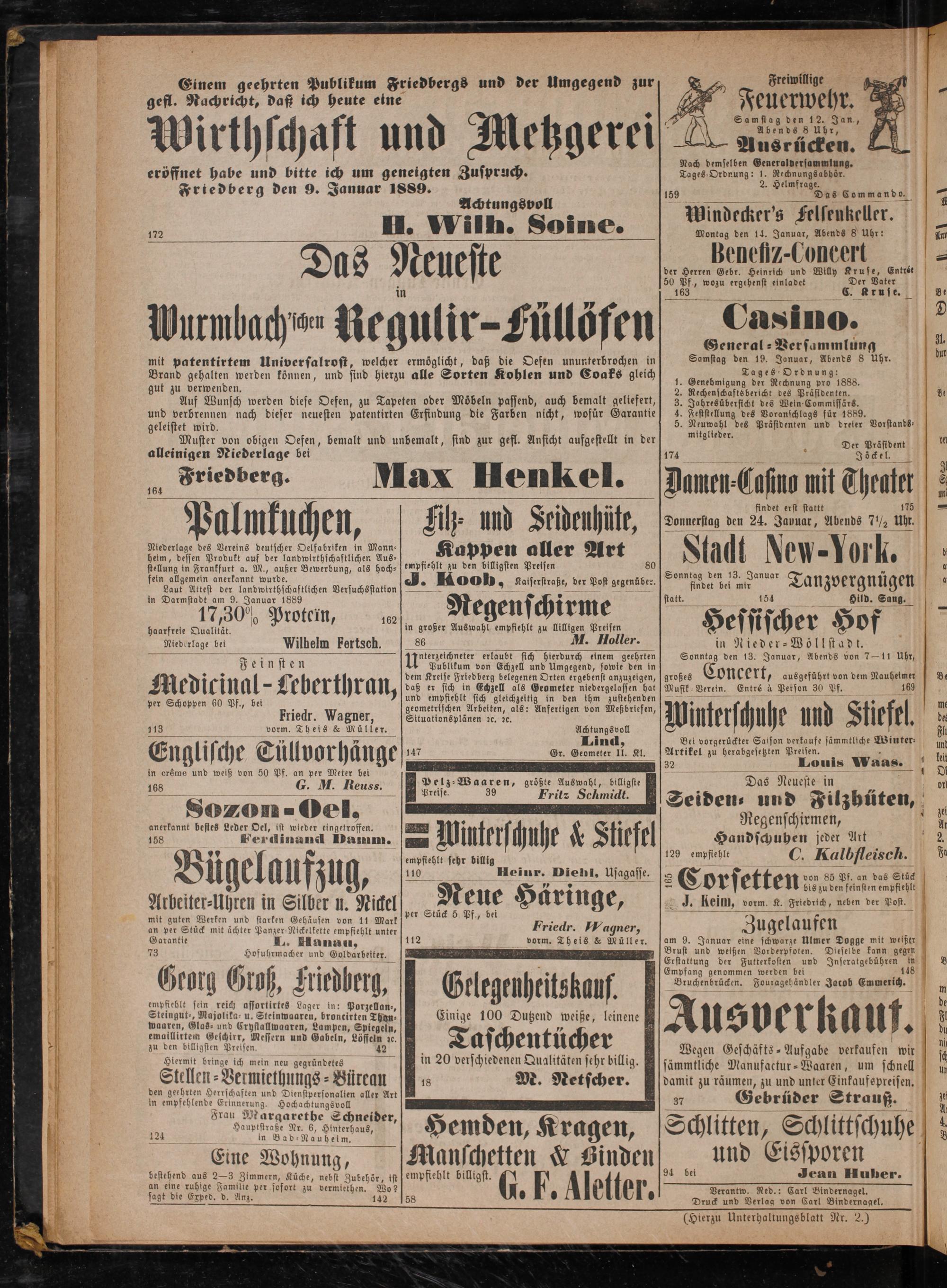 eröffnet habe und bitte ich um geneigten Zuspruch. Friedberg den 9. Januar 1889.