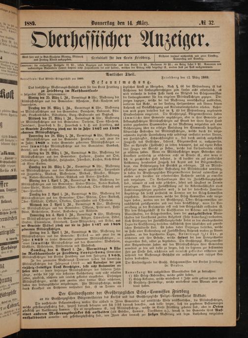 Das diesjährige Musterungs-Geschäft wird für den Kreis Friedberg zu Friedberg im Rathhaussaale n folgender Weise vorgenommen: Montag den 25. März l. IJs., Vormittags 9 Uhr, Musterung der