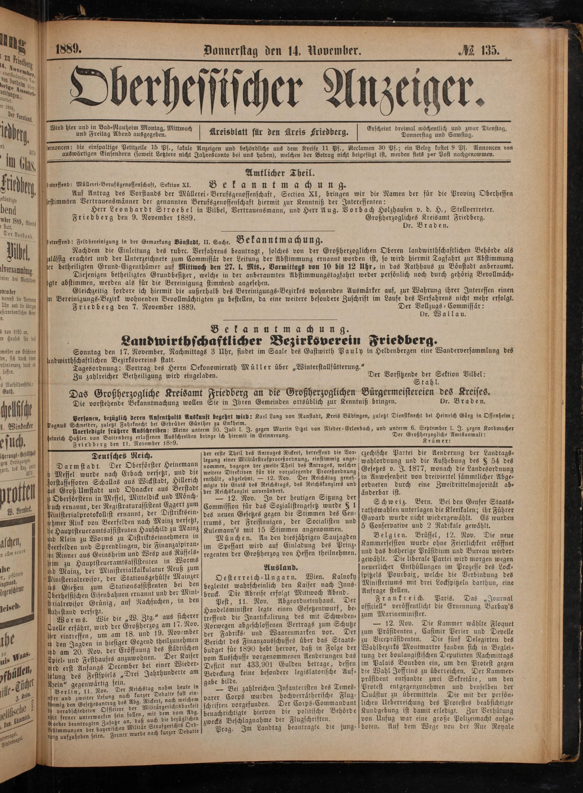 Friedberg den 9. November 1889. Großherzogliches Kreisamt Friedberg. Dr. Braden.