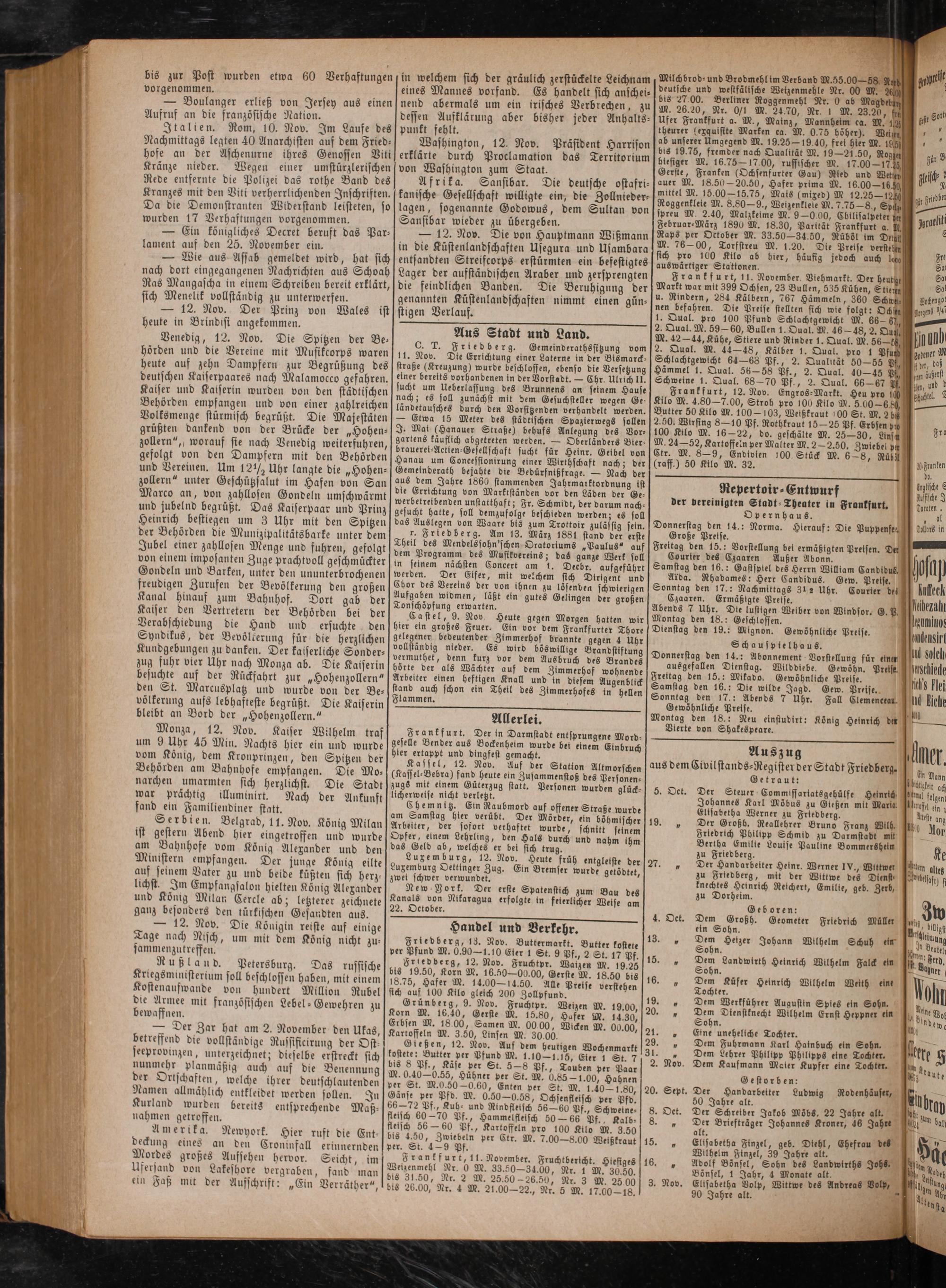 auswärtiger Stattonen. Frankfurt, 11. November. Viehmarkt. Der heutige Markt war mit 399 Ochsen, 23 Bullen, 535 Kühen, Stieng