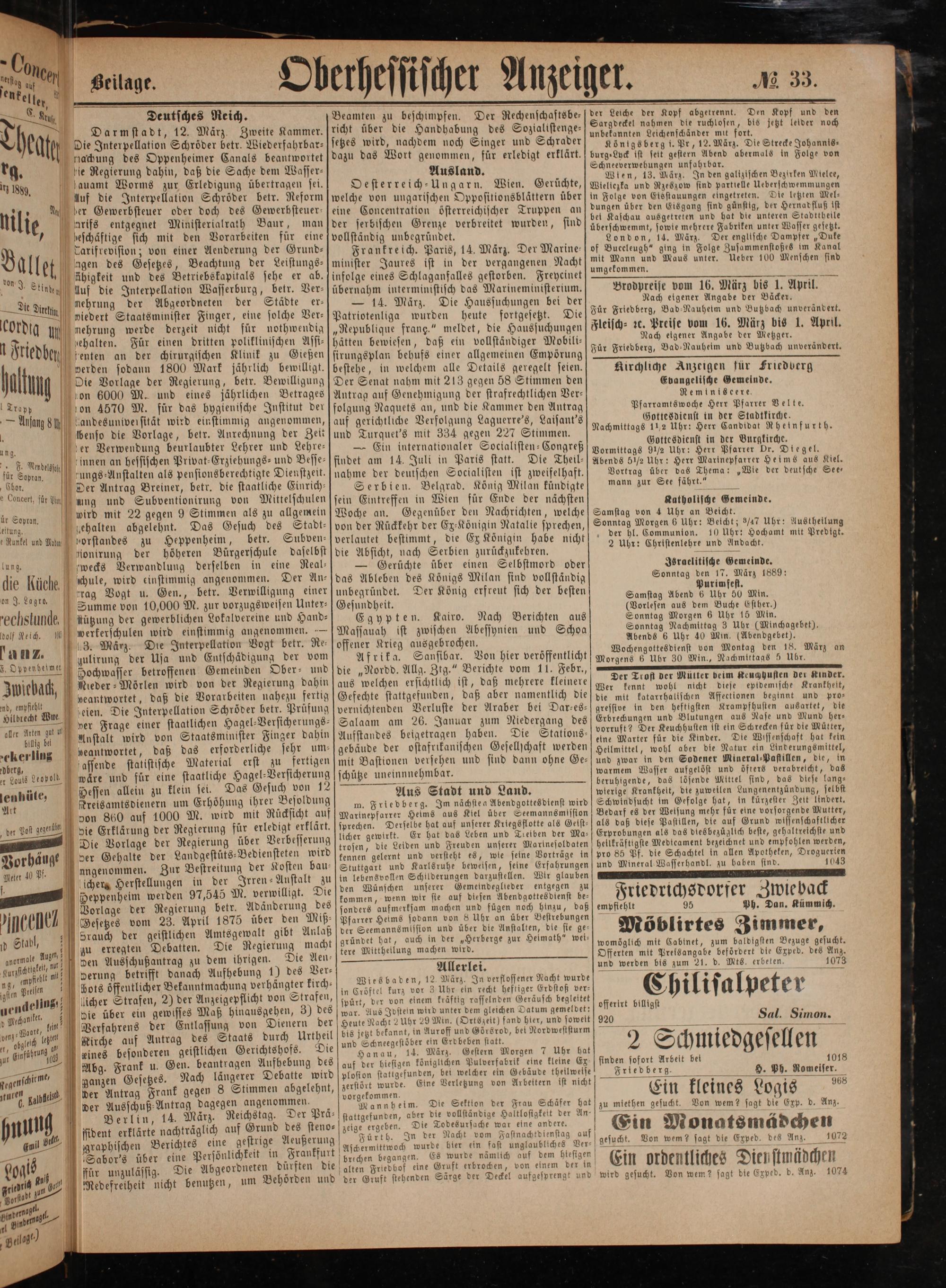 Israelitische Gemeinde. Sonntag den 17. März 1889: Purimfest. Samstag Abend 6 Uhr 50 Min. (Vorlesen aus dem Buche Esther.) Sonntag Morgen 6 Uhr 16 Min. Sonntag Nachmittag 3 Uhr(Minchagebet), Abends 6 Uhr 40 Min,(Abendgebet). Wochengottesdienst von Montag den 18. März an Morgens 6 Uhr 30 Min., Nachmittags 5 Uhr.