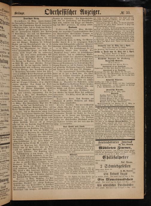Kirchliche Anzeigen für Friedberg Evangelische Gemeinde. Reminiscere. Pfarramtswoche Herr Pfarrer Velte. Gottesdienst in der Stadtkirche. Nachmittags 1½ Uhr: Herr Candidat Rheinfurth. Gottesdienst in der Burgkirche. Vormittags 9½ Uhr: Herr Pfarrer Dr. Diegel. Abends 5½ Uhr: Herr Marinepfarrer Heims aus Kiel. Vortrag über das Thema:„Wie der deutsche See— mann zur See fährt.“