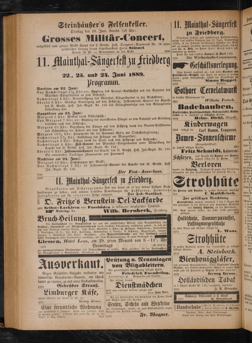Mainthal-Sängerbundes an dem Bahnhof; ö f Nachmittags 4 Uhr: Vertretersitzung des Mainthal⸗Sängerbundes in der Reichskrone; in feinster Winkerwaare bel ditteffen 1 Abends 8 Uhr: Gesellige Vereinigung auf dem Festplatz; Instrumental-Concert der Kapelle 2341 Wilhelm Fertsch. D 90 f des II. Großh. Hess. Inf.-Regts. Nr. 116 und Gesangsvorträge von dem Gesangverein 5— 0 0 ä Liederkranz bien Badehauben., 1 Hauptfeier am 23. Juni: 2 125 Frottirtücher, Frottirhandschuhe, Badepantoffel, Rücken, N 1 Morgens 6 Uhr: Weckruf durch Böllerschüsse;. reiber ꝛc. ꝛc. empfiehlt zu billigsten Preisen Betreffen 1 7 1 Von Morgens 7 Uhr an: Empfang der eintreffenden Sänger an dem Bahnhof und Geleitung 2354 Heinr. Diehl, Usagasse. 1 N derselben nach dem Festplatze; c 6 ö 9 Morgens 10 Uhr: Begrüßung der Sänger auf dem Festplatz durch den Bundes⸗Präsidenten Kinderwagen des reiß 0 1 und Schmückung der Fahnen mit dem Festbande; 35 1 8 In. 0 1 Morgens 10 ½ Uhr: Hauptprobe für die Gesammk- Cböre mit Orchesterbegleitung;. Carl Damm, Usagasse. 13 Nachmittags 2¼ Uhr: Aufstellung des Festzugs am Mainzerth 1 achmittag 2 Uhr: Aufstellung des Festzugs am Mainzerthor; 7 1 Nachmittags 3 Uhr: Festzug durch die Stadt nach dem Festplatze und Ansprache; Damen-Sonnenschirme 1 Nachmittags 4 Uhr: Fest⸗Contert des Mainthal-⸗Sängerbundes unter Mitwirkung der f f n 95 1 Kapelle des II. Großh. Hess. Inf.⸗Regts. Nr. 116; e e 267 diba n 13 Abends 6 Uhr: Instenmental⸗Contert der Kapelle des II. Großh. Hess. Inf.⸗Regts. Nr. 116. 8 1 10 8 + id l. 1 Bei eintretender Dunkelheit Illumination und Feuerwerk, 3 Z Schm„Kaiserstr. e Nachfeier am 24. Juni: ü das Neueste für Damen und seinder, dnl Morgens 10 Uhr: Frühschoppen mit Musik; Schürzen, außerst billig bet J. Keim. 9 nur it Von Nachmittags 3 Uhr ab Instrumental-Concert der Kapelle des II. Großh. Hess. Verloren 2344 J Jacsmal Juf.⸗Regts. Nr. 116. wunde u Bie ine Belob bes 9 1. rde ein Notizbuch. 1 onun ahn 9 2340 Der Fest- Ausschuss. Jatbzugeben bel e bel Fun Walz. 1 1 1 Hage 8— ß—— 8 1 N 1 2339 5 498 1 2 2 7 Zahl unte 1 Hainthal⸗ängerfest zu Friedberg 90 1 N N E auf die V. 1 a Einzelkarten und Festprogramme sind von heute ab in den beiden hiesigen Buch— 3 3 handlungen zu haben, auch nehmen dieselben Aumeldungen für Festkarten, Familien- far Herren und Knaben in großer Auswahl empfiehlt 1 f 801 C. Kalh fleisch, alen e