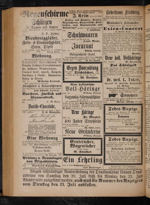Wegen vollständiger Neuherstellung der Druckmaschine können Druck⸗ Wbetten von Samstag den 20. Juli früh bis Montag den 22. Juli Abends nicht ausgeführt werden, auch muß die Nummer des vom Dienstag den 23. Juli ausfallen.