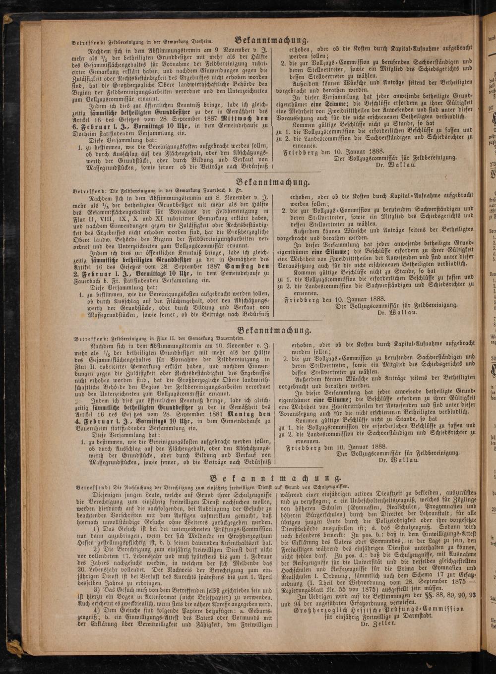 ernennen. Friedberg den 10. Januar 1888. Der Vollzugscommissär für Feldbereinigung. Dr. Wallau.