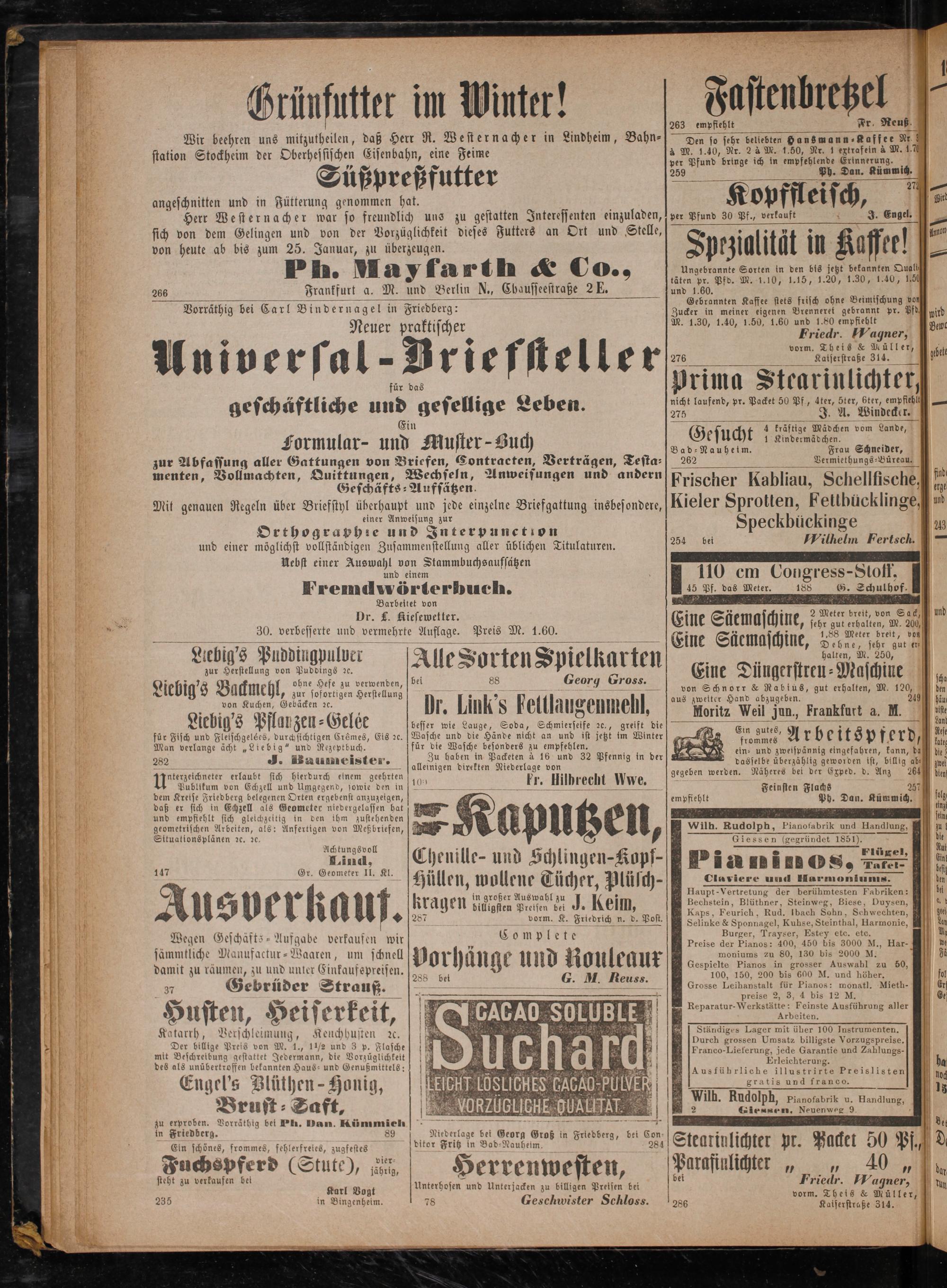 70 Giessen(gegründet 1851). N 1 5 PI Elüzel, E ö ani OS,. Tafci- bet Claviere und Harmonlums den HHFaupt-Vertretung der berühmtesten Fabriken: bil Bechstein, Blüthner, Steinweg, Biese, Duysen,! Kaps, Feurich, Rud. Ibach Sohn, Schwechten, del Selinke& Sponnagel, Kuhse, Steinthal, Harmonie, Lan Burger, Trayser, Estey etc. eto. M Preise der Pianos: 400, 450 bis 3000 M., Har- bt moniums zu 80, 130 bis 2000 M. Fa Gespielte Pianos in grosser Auswabl zu 50, 100, 150, 200 bis 600 M. und höher. fol Grosse Leihanstalt für Pianos: monatl. Mieth- Er preise 2, 3, 4 bis 12 M. Oe Reparatur- Werkstätte: Feinste Ausführung aller Arbeiten. Ständiges Lager mit üher 100 Instrumenten. Durch grossen Umsatz billigste Vorzugspreise. Franco-Lieferung, jede Garantie und Zahlungs- 0 Erleichterung. ha Ausführliche illustrirte Preislisten Hoc 55 gratis und franco. 1 15 * Vb. Rudolph, Pianofabrik u. Handlung, 9 2 Giessen. Neuenweg 9 0 det 1 2. Steariulichter pr. Packet 50 Pf d Parafiulich Parafinlichter„„ 40„ un bei Friedr. MWagner, un vorm. Theis& Müller, 286 Kaiserstraße 314.