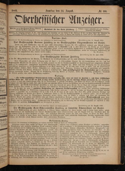 mal zun 1 auswärtigen Einsendern(soweit Letztere nicht Jahresconto bei uns haben), welchen der Betrag nicht beigefügt ist, werden stets per Post nachgenommen. 05——————— Sone g 5 ringe, Amtlicher Theil. 0 Betreffend: Die Krankenversicherung der Arbeiter, hier insbesondere der Familienangehörigen. Friedberg den 21. August 1889. len, 0 Das Großherzogliche Kreisamt Friedberg an die Großherzoglichen Bürgermeistereien des Kreises. K Indem wir unser Ausschreiben vom 23. Juli 1889(Oberhessischer Anzeiger Nr. 87) nachstehend nochmals zum Abdruck bringen,