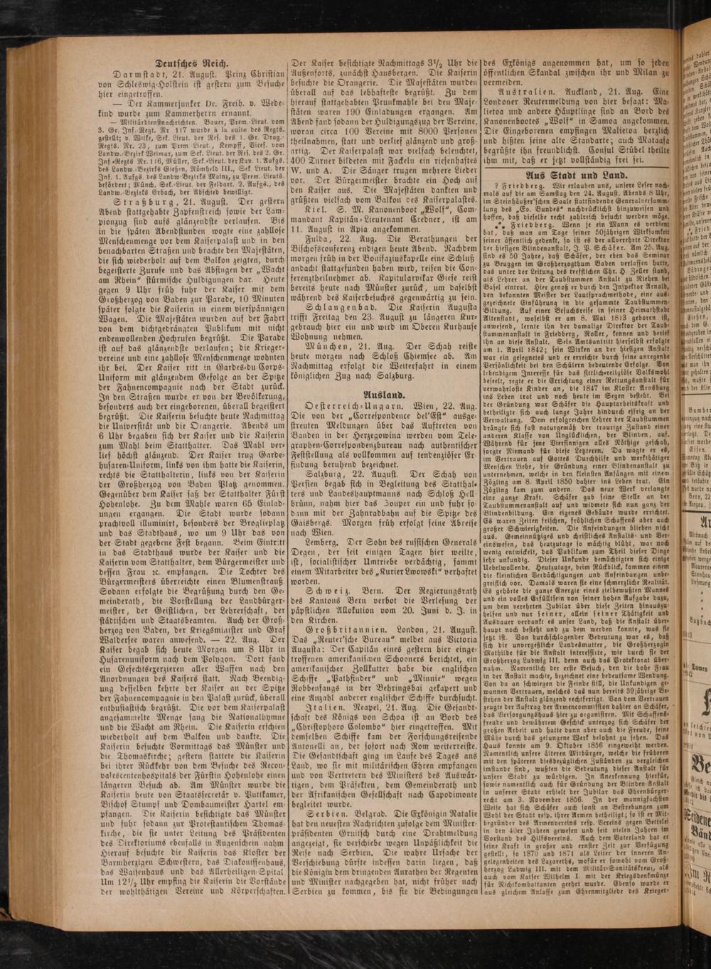 Der Kaiser besichtigte Nachmittags 3½ Uhr die Außenforts, zunächst Hausbergen. Die Kaiserin besuchte die Orangerie. Die Majestäten wurden überall auf das lebhafteste begrüßt. Zu dem hierauf stattgehabten Prunkmahle bei den Maje— stäten waren 190 Einladungen ergangen. Am Abend fand sodann der Huldigungszug der Vereine, woran circa 100 Vereine mit 8000 Personen theilnahmen, statt und verlief glänzend und groß— artig. Der Kaiserpalast war vielfach beleuchtet, 400 Turner bildeten mit Fackeln ein riesenhaftes W. und A. Die Sänger trugen mehrere Lieder vor. Der Bürgermeister brachte ein Hoch auf den Kaiser aus. Die Majestäten dankten und grüßten vielfach vom Balkon des Kaiserpalastes.