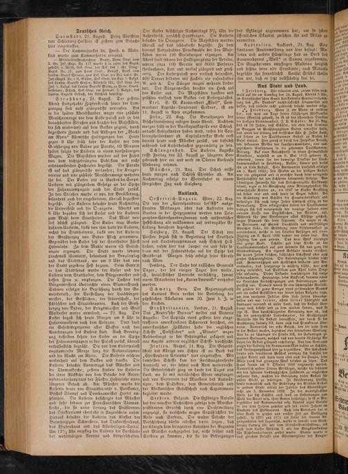 Straßburg, 21. August. Der gestern Abend stattgehabte Zapfenstreich sowie der Lam— pionzug sind aufs glänzendste verlaufen. Bis in die späten Abendstunden wogte eine zahllose Menschenmenge vor dem Kaiserpalast und in den benachbarten Straßen und brachte den Majestäten, die sich wiederholt auf dem Balkon zeigten, durch begeisterte Zurufe und das Absingen der„Wacht am Rhein“ stürmische Huldigungen dar. Heute gegen 9 Uhr früh fuhr der Kaiser mit dem Großherzog von Baden zur Parade, 10 Minuten später folgte die Kaiserin in einem vierspännigen Wagen. Die Majestäten wurden auf der Fahrt von dem dichtgedrängten Publikum mit nicht endenwollenden Hochrufen begrüßt. Die Parade ist auf das glänzendste verlaufen; die Krieger— vereine und eine zahllose Menschenmenge wohnten ihr bei. Der Kaiser ritt in Gardes-du Corps— Uniform mit glänzendem Gefolge an der Spftze der Fahnencompagnie nach der Stadt zurück. In den Straßen wurde er von der Bevölkerung, besonders auch der eingeborenen, überall begeistert begrüßt. Die Kaiserin besuchte heute Nachmittag die Universität und die Orangerie. Abends um 6 Uhr begaben sich der Kasser und die Kaiserin zum Mahl beim Statthalter. Das Mahl ver— lief höchst glänzend. Der Kaiser trug Garde— husaren⸗Uniform, links von ihm hatte die Kaiserin, rechts die Statthalterin, links von der Kaiserin der Großherzog von Baden Platz genommen. Gegenüber dem Kaiser saß der Statthalter Fürst Hohenlohe. Zu dem Mahle waren 65 Einlad— ungen ergangen. Die Stadt wurde sodann prachtvoll illuminirt, besonders der Broglieplatz und das Stadthaus, wo um 9 Uhr das von der Stadt gegebene Fest begann. Beim Eintritt in das Stadthaus wurde der Kaiser und die Kaiserin vom Statthalter, dem Bürgermeister und dessen Frau ꝛc. empfangen. Die Tochter des Bürgermeisters überreichte einen Blumenstrauß Sodann erfolgte die Begrüßung durch den Ge— meinderath, die Vorstellung der Landbürger— meister, der Geistlichen, der Lehrerschaft, der städtischen und Staatsbeamten. Auch der Groß— herzog von Baden, der Kriegsmigister und Graf Waldersee waren anwesend.— 22. Aug. Der Kaiser begab sich heute Morgen um 8 Uhr in Husarenuniform nach dem Polygon. Dort fand ein Gefechtsezerzieren aller Waffen nach den Anordnungen des Kaisers statt. Nach Beendig ung desselben kehrte der Kaiser an der Spitze der Fahnencompagnie in den Palast zurück, überall enthusiastisch begrüßt. Die vor dem Kaiserpalast angesammelte Menge sang die Nationalhymne und die Wacht am Rhein. Die Kaiserin erschien wiederholt auf dem Balkon und dankte. Die Kaiserin besuchte Vormittags das Muͤnster und die Thomaskirche; gestern stattete die Kaiserin bei ihrer Rückkehr von dem Besuche des Recon— valescentenhospitals der Fürstin Hohenlohe einen längeren Besuch ab. Am Münster wurde die Kaiserin heute von Staatssecretär v. Puttkamer, Bischof Stumpf und Dombaumeister Hartel em pfangen. Die Kaiserin besichtigte das Münster und fuhr sodann zur Protestantischen Thomas kirche, die sie unter Leitung des Präsidenten des Direktoriums ebenfalls in Augenschein nahm Hierauf besuchte die Kaiserin das Kloster der
