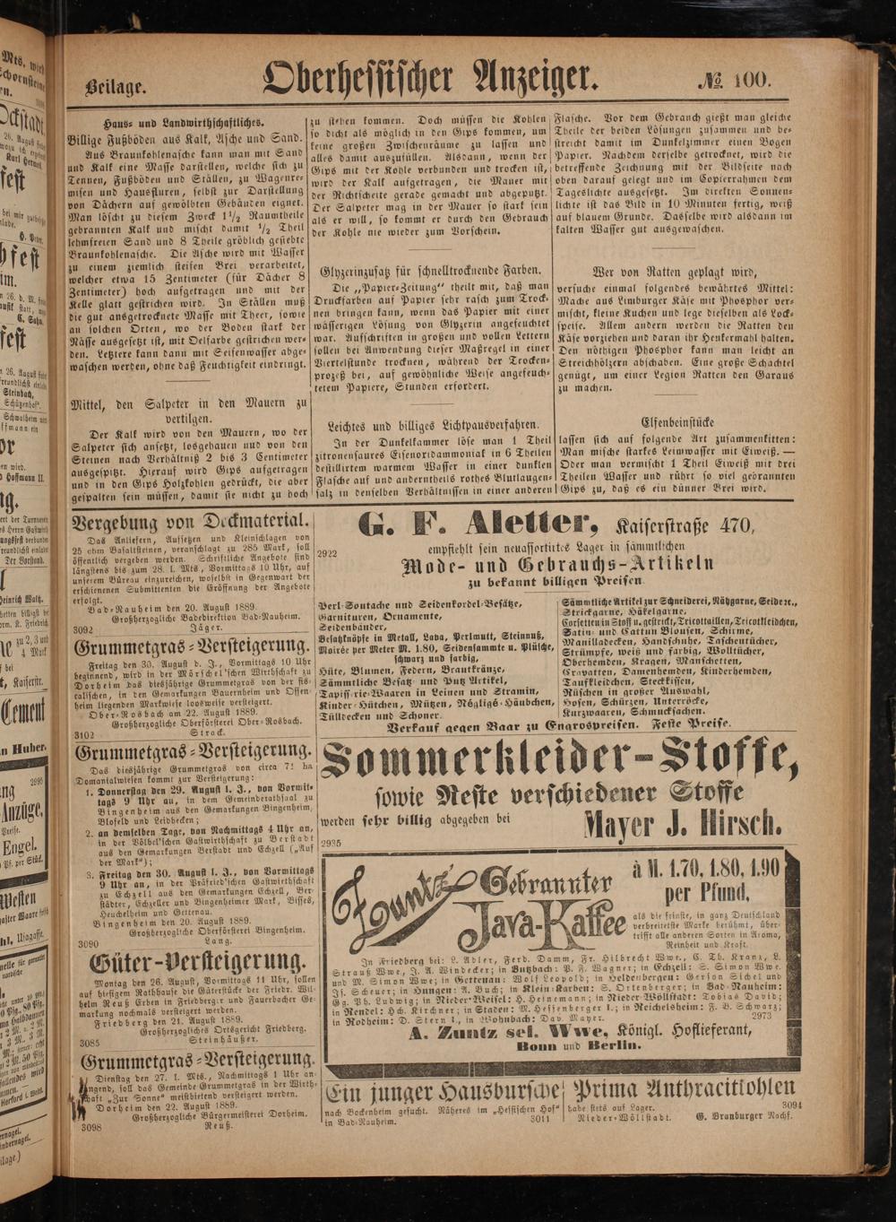 Eugel. in der Völbel'schen Gastwirthschaft zu Berstad O Stick aus den Gemarkungen Berstadt und Echzell(„Au Pf. per Sti, der Mark“); 3. Freitag den 30. August l. J., von Vormittags — 9 Uhr an, in der Präfried'schen Gastwirthschaf sten N zu Echzell aus den Gemarkungen Echzell, Ber- he 1 städter, Echzeller und Bingenheimer Mark, Bisses, after Bacre fit N Heuchelheim und Gettenau. g Bingenheim den 20. August 1889.