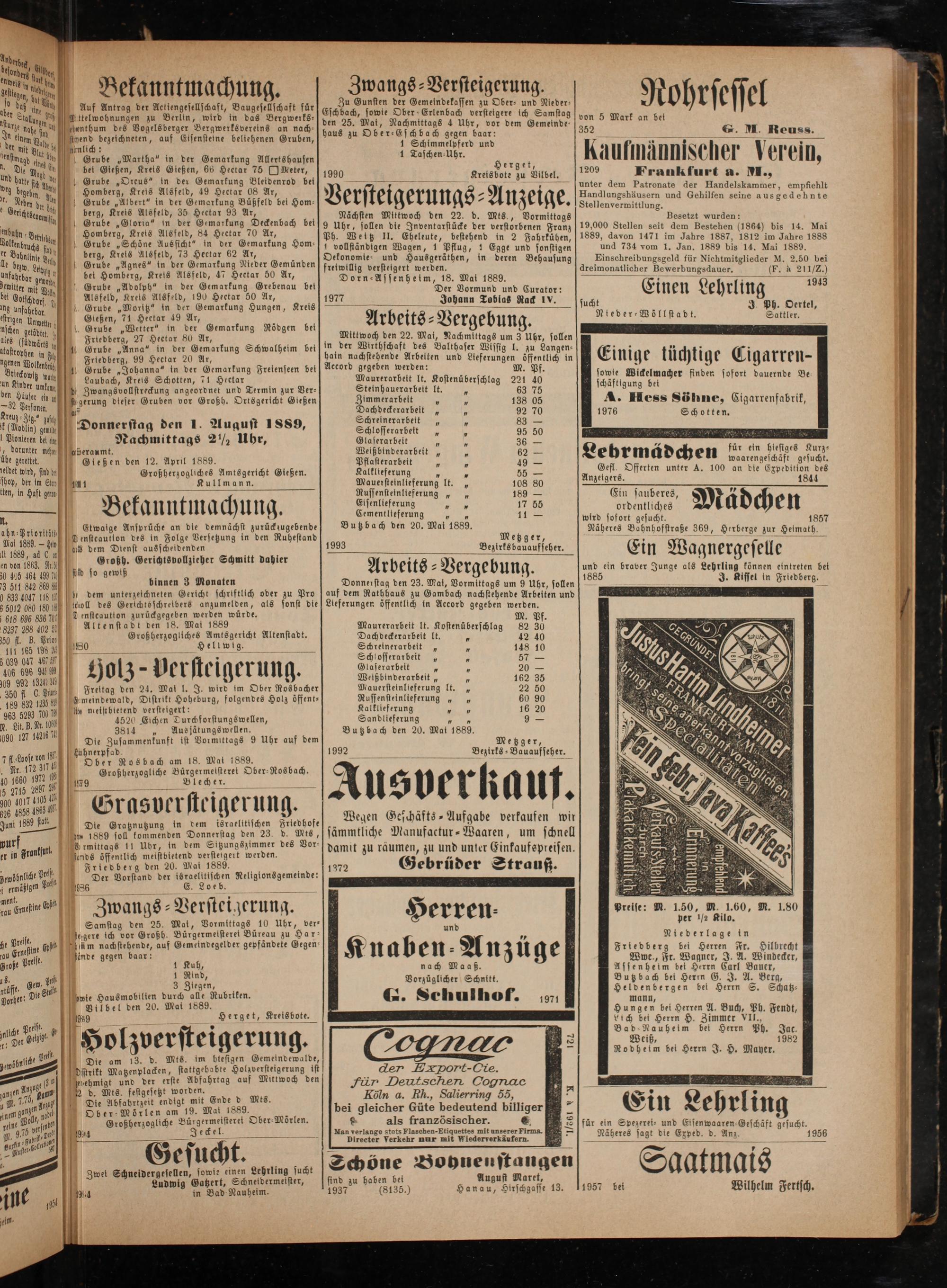 ande gegen baar: N 5 1 Kuh, 1 Rind, 3 Ziegen, wie Hausmobilien durch alle Rubriken. Vilbel den 20. Mai 1889. a 19859 Herget, Kreisbote.