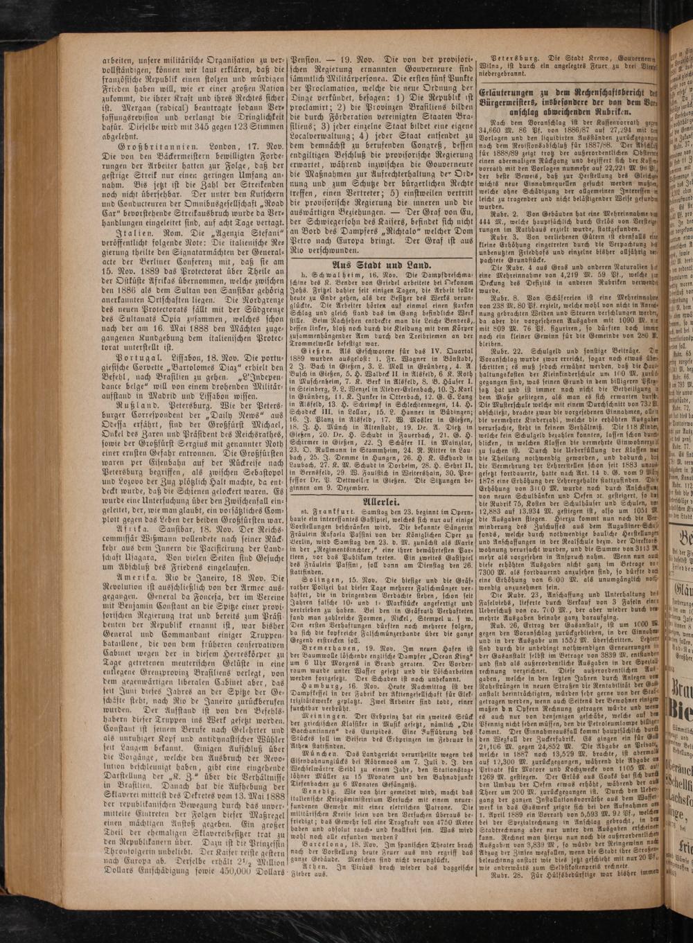 Amerika. Rio de Janeiro, 18. Nov. Die Revolution ist ausschließlich von der Armee aus— gegangen. General da Foncesa, der im Vereine mit Benjamin Constant an die Spitze einer provi— sorischen Regierung trat und bereits zum Präsi— denten der Republik ernannt ist, war bisher General und Commandant einiger Truppen— bataillone, die von dem früheren conservativen Cabinet wegen der in diesem Heereskötper zu Tage getretenen meuterischen Gelüste in eine entlegene Grenzprovinz Brasiliens verlegt, von dem gegenwärtigen liberalen Cabinet aber, das seit Juni dieses Jahres an der Spitze der Ge— schaͤfte steht, nach Rio de Janeiro zurückberufen wurden. Der Aufstand ist von den Befehls— habern dieser Truppen ins Werk gesetzt worden. Constant ist seinem Berufe nach Gelehrter und als unruhiger Kopf und antidynastischer Wühler seit Langem bekannt. Einigen Aufschluß über die Vorgänge, welche den Ausbruch der Revo— lution beschleunigt haben, gibt eine eingehende Darstellung der„K. Z.“ über die Verhältnisse in Brasilten. Danach hat die Aufhebung der Sklaverei mittelst des Dekretes vom 13. Mai 1888 der republikanischen Bewegung durch das unver— mittelte Eintreten der Folgen dieser Maßregel einen mächtigen Anstoß gegeben. Ein großer Theil der ehemaligen Sklavereibesitzer trat zu den Republikanern uͤber. Dazu ist die Prinzessin Throufolgerin unbeliebt. Der Kaiser reiste gestern nach Europa ab. Derselbe erhält 2½ Million Dollars Entschädigung sowie 450,000 Dollars