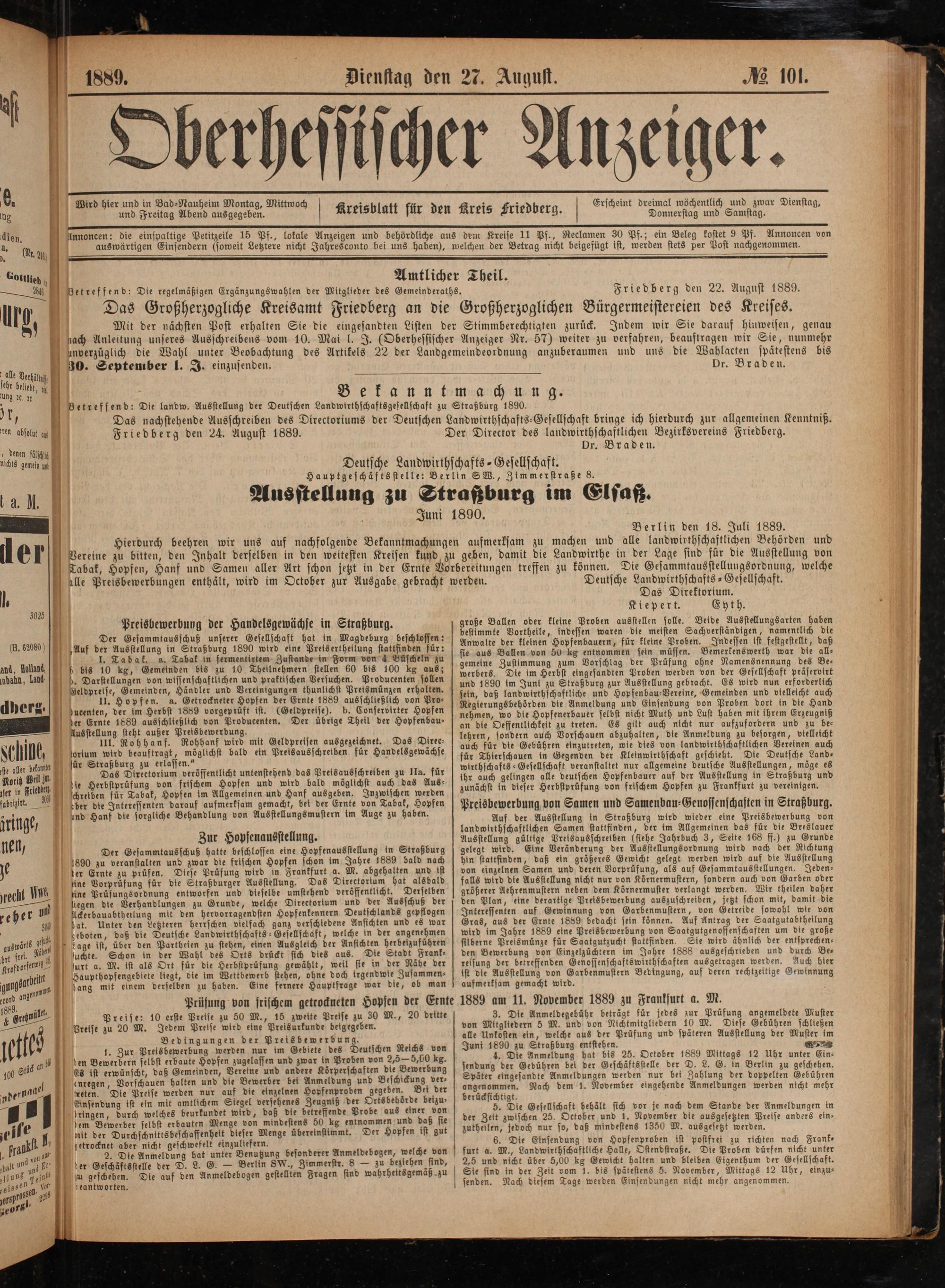 Bekanntmachung. Betreffend: Die landw. Ausstellung der Deutschen Landwirthschaftsgesellschaft zu Straßburg 1890. Das nachstehende Ausschreiben des Directoriums der Deutschen Landwirthschafts-Gesellschaft bringe ich hierdurch zur allgemeinen Kenntniß. Friedberg den 24. August 1889. Der Director des landwirthschaftlichen Bezirksvereins Friedberg. Dr. Braden.