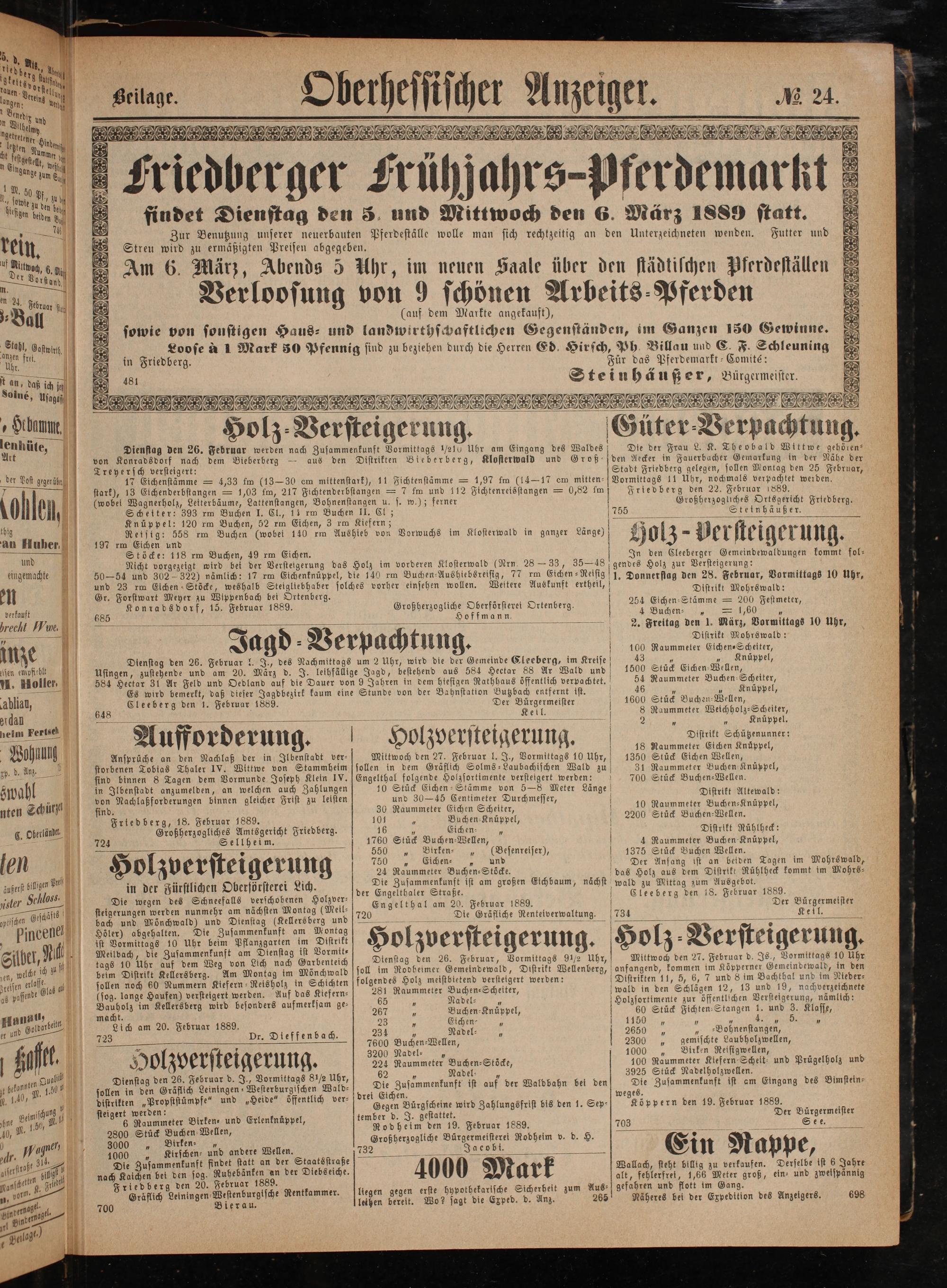 Stadt Friedberg gelegen, sollen Montag den 25 Februar, Vormittags 11 Uhr, nochmals verpachtet werden. Friedberg den 22. Februar 1889. Großherzogliches Ortsgericht Friedberg. Steinhäußer.