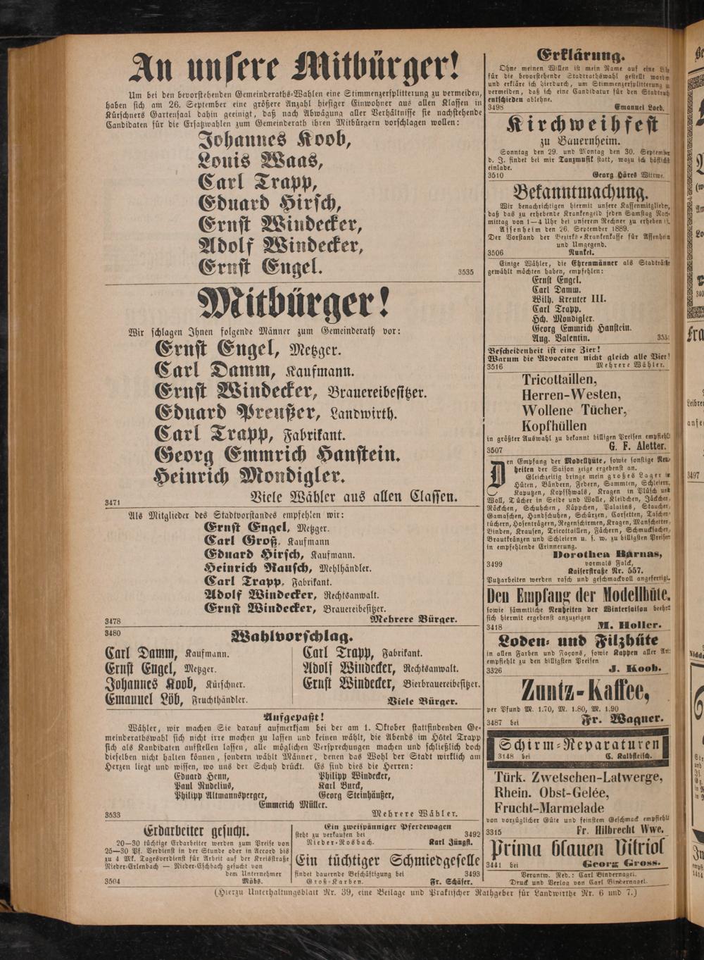 Waͤhler, wir machen Sie darauf aufmerksam bei der am 1. Oktober stattfindenden Ge— meinderathswahl sich nicht irre machen zu lassen und keinen wählt, die Abends im Hötel Trapp sich als Kandidaten aufstellen lassen, alle möglichen Versprechungen machen und schließlich doch dieselben nicht halten können, sondern wählt Männer, denen das Wohl der Stadt wirklich am Herzen liegt und wissen, wo uns der Schuh drückt. Es sind dies die Herren: