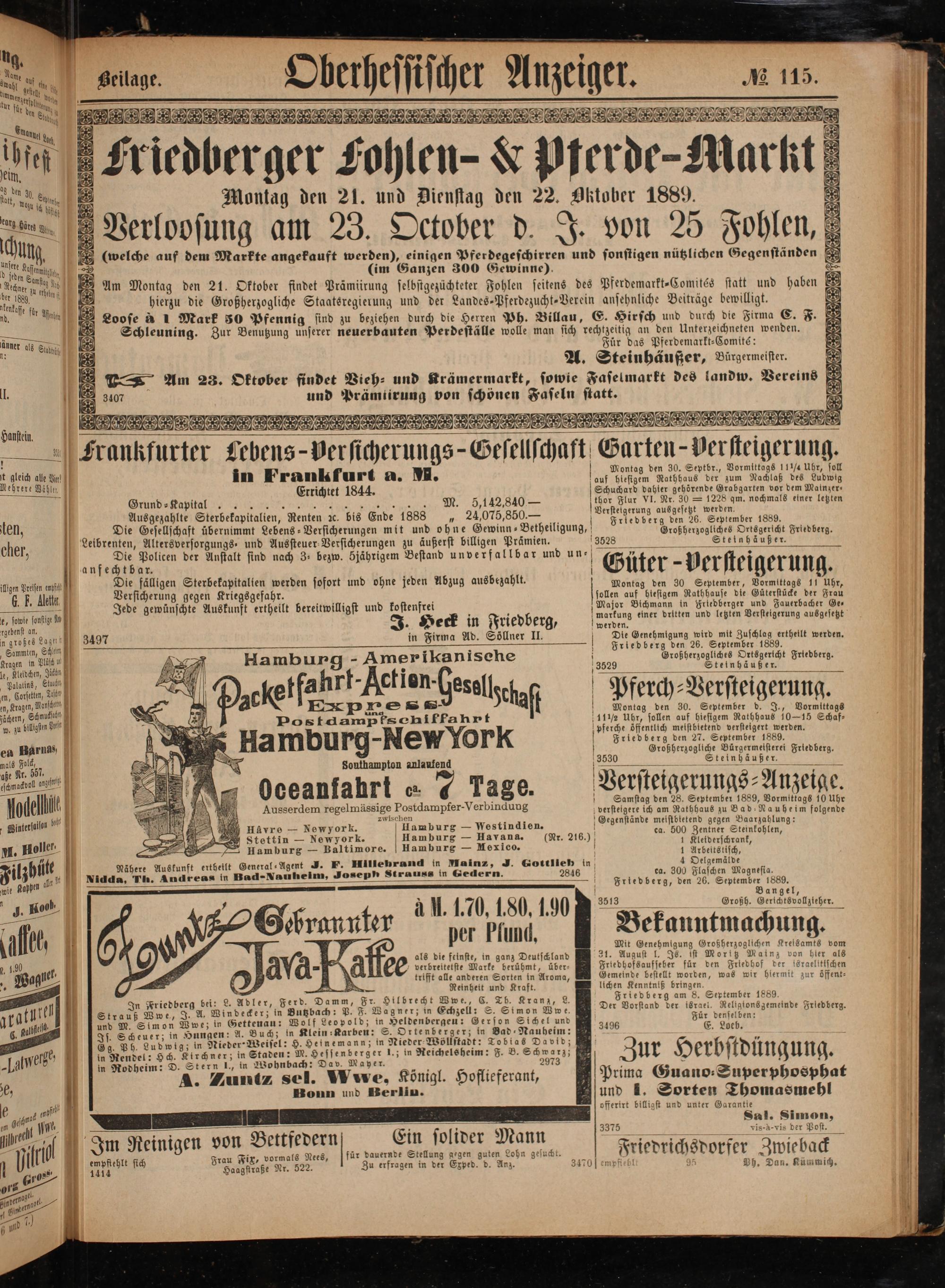 8 8 Scamstag den 28. September 1889, Vormittags 10 u Tode 0 ö Ausserdem regelmässige Postdampfer- Verbindung eee 16 3 Rothaus zu ad N 5 1 15 zwischen „ Uinterlelun%, Havre— Newyork. lamburg— Mestindien. nne ler. 2 Stettin— Newyork. Hamburg— Havana.(Nr. 216.) 1 Kleiderschrank, 1 M. 1 Holler r 5 Hamburg— Baltimore. Hamburg— Mexico. ö 1 Arbeitstisch, Filzhül. Nähere. ertheilt General-Agent J. F. Hlilehrand in Mainz, J. Gottlieh in 4 Oelgemälde. Nidda, Tu. Andree in Bad-Nauhelm, Joseph Strauss in Gedern. 2846 ea. 300 Flaschen Mognesia. 5 il z A M* ä—— Friedberg, den 26. September 1889. ö ö Bangel, l 8 ooh. 1 f 0 0 3513 Großh. Gerlichtsvollzteher. 4. Ke. Ge ter d U. 1.70, l. 80. 1.9 5 abe. ebrannle per Plund Bekanntmachung. * 0 4 9 Mit Genehmigung Großherzoglichen Kreisamts vom 15 als die feinste, in ganz Deutschland 31. August l. Is. sst Moritz Mainz von hier als N. 1.90 et, 15 9 d- fil ce verbreitetste Marke berühmt, über⸗ Friedhofsaufseber für den Friedhof der(sraelitlschen i agl N trifft alle anderen Sorten in Aroma, Gemeinde bestellt worden, was wir hiermit zur öffent⸗ — 4 Reinheit und Kraft. 5. Kenntniß bringen. 4 N 8 ber 1889. dberg bei: L. 20 Ferd. 2 Fr Hilbrecht Wwe., C. Th. Kranz, L. riedberg am 8. Septem r 9 N n J9. Windecker; in Butzbach:. F. Wagner; in Echzell: S. Simon W w e. Der Vorstand der israel. enden Frledberg. L ell, 44 und M. Simon Wwe; in Gettenau: Wolf N in Heldenbergen: Gerson Sichel und 3496 N* 6. Kah. Is. Scheuer; in Hungen: A. Buch; in Alein,Karben: Sr gell in Bad Nauheim: i. e a Gg. Ph. Ludwig; in Nieder“ Weisel: H. Heinemann; in Nieder Wöllstadt: Tobias David; AN were; in. Hch.. in Staden: M. Hessenberger I.; in Reichelsheim: F. B. Schwarzz Ur er stdüngung. L i in Rodheim: D. Stern 1., in Wohnbach: Dav. Mayer. 1* 2973 5 Ne 8 2 5 2 0 1 A. Zuntz sel. Wwe. Königl. Hoflieferant, Prima Guano-Superphosphat 5 Bonn und Berlin. und 1. Sorten Thomasmehl 6 1 5 lofferirt billigst und unter Garantie ge de ECC„ F grob„ F 9 7 5 vis-à-vis der Po fine,(Im Reinigen von Bettfedern Ein solider Mann f N 9 u. dauernde Stellung gegen guten Lohn gesucht. Friedrichsdorfer Zwieback