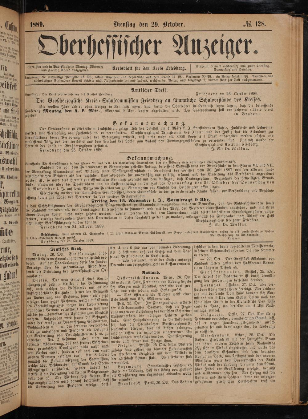 Karl Gt. ob, le 5 N 5 5 8 padbaus zur Son Unnoncen: die einspaltige Petitzeile 15 Pf., lokale Anzeigen und behördliche aus dem Kreise 11 Pf., Reclamen 30 Pf.; ein Beleg kostet 9 Pf. Annoncen von eihf m. f 3 Amtlicher Theil. ts. fü hgetreffend: Die Kreis Lehrereonferenz des Kreises Friedberg. Friedberg am 26. October 1889.