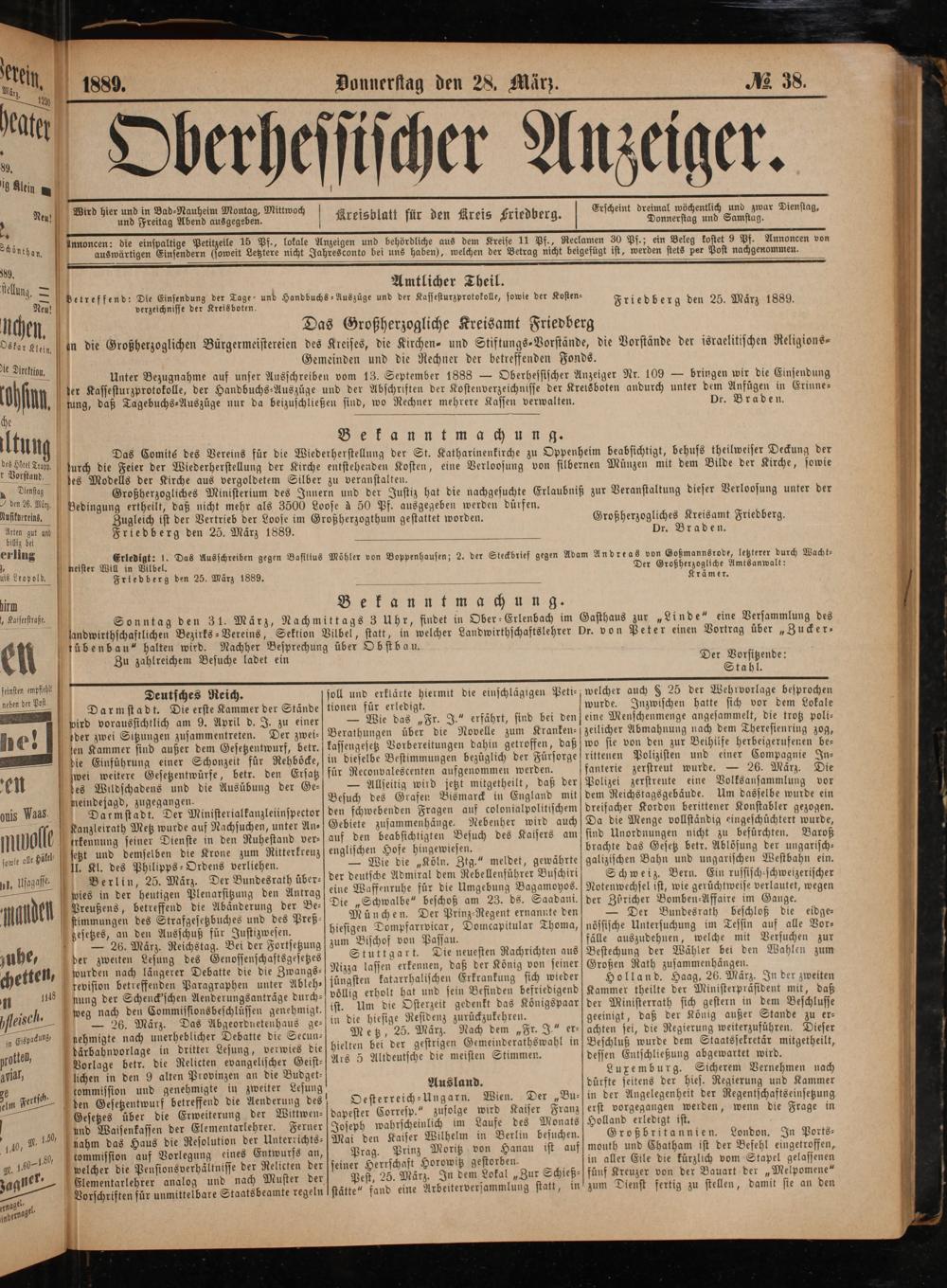 neister Will in Vilbel. Friedberg den 25. März 1889.