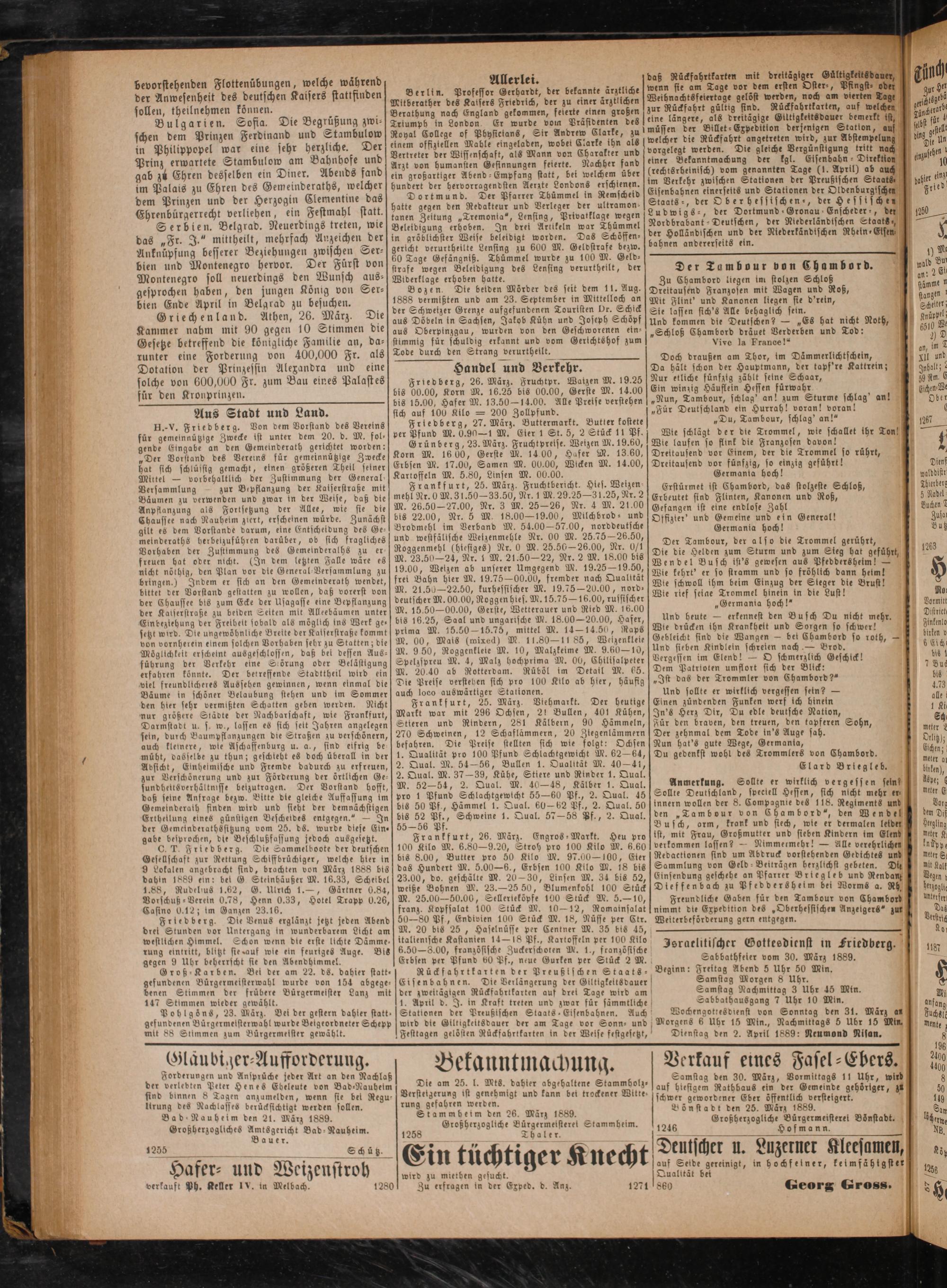 Freundliche Gaben für den Tambour von Chambord nimmt die Expedition des„Oberhessischen Anzeigers“ zur Weiterbeförderung gern entgegen.