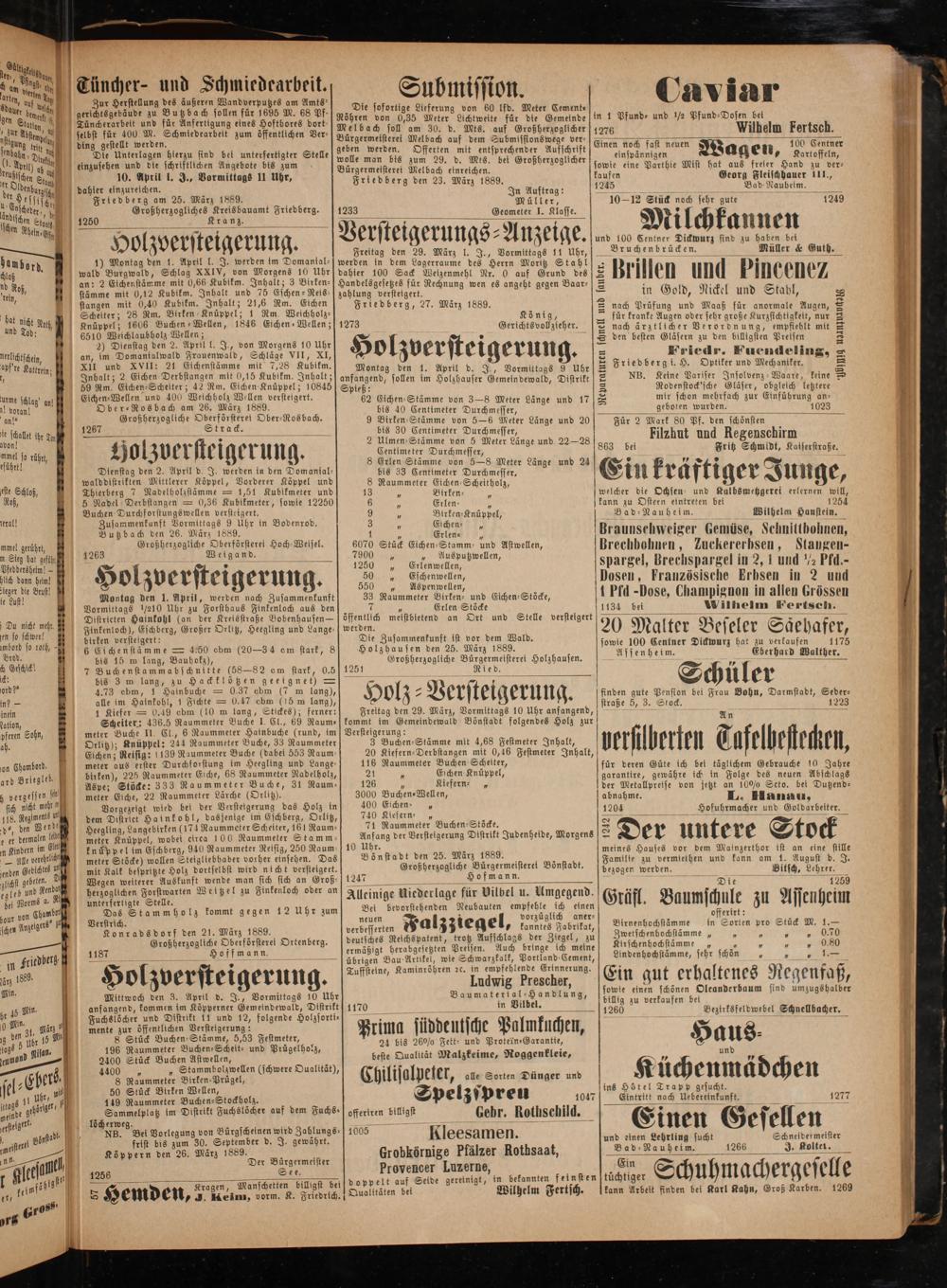 werden. Die Zusammenkunft ist vor dem Wald. Holzhausen den 25. März 1889. Großherzogliche Bürgermeisterei Holzhausen.