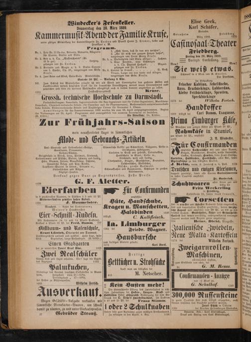 1274 bei Wilhelm Fertsch. 2 Zweigarurollen. 28 2 5 S zum Einfädeln von oben, bei E 3 G. M. Reuss. Cousirmanden-Auzüge von 12 Mark an. G. Schulhof. 1248
