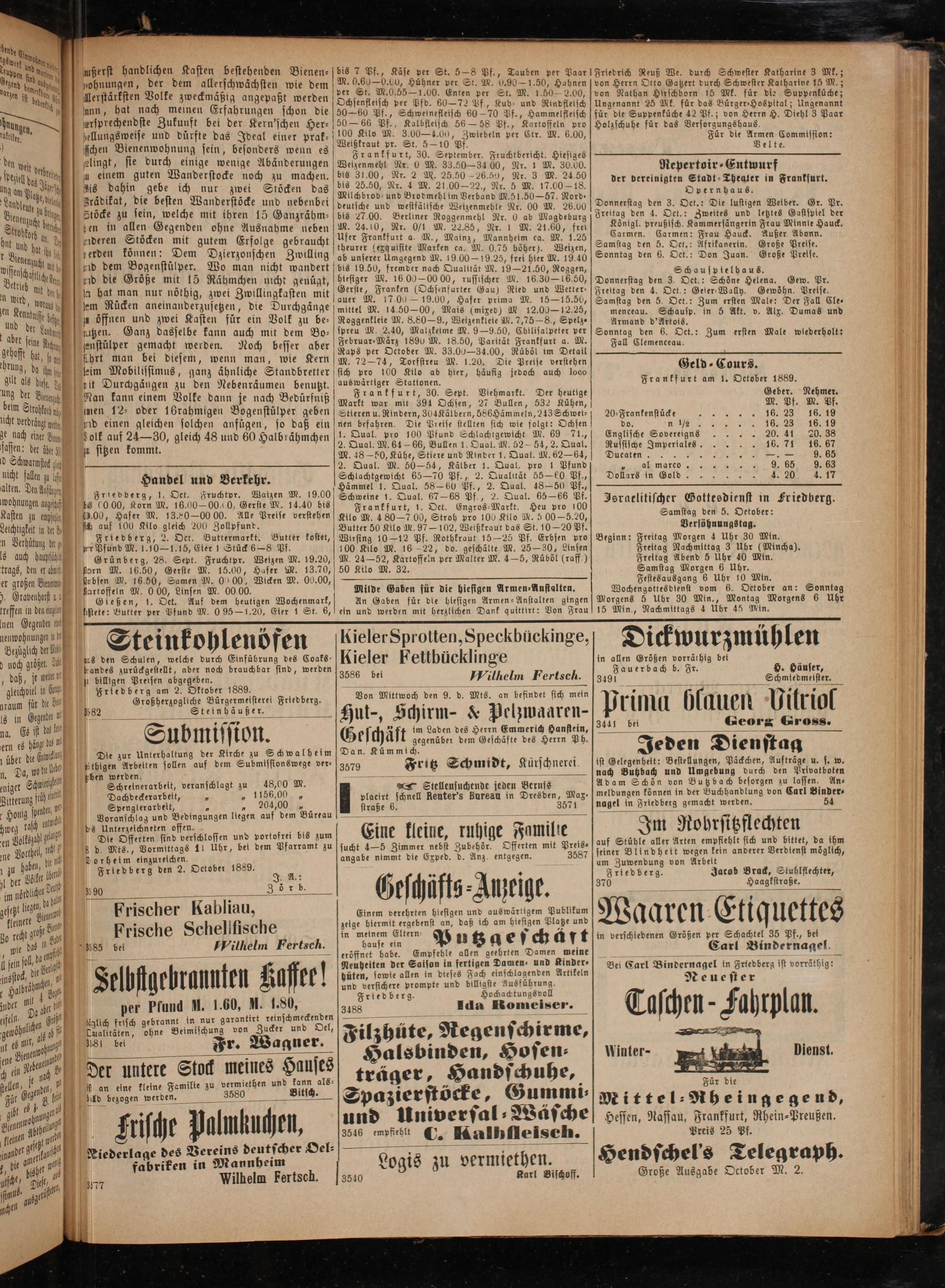 Frankfurt, 30. September. Fruchtbericht. Hiesiges Weizenmehl Nr. 0 M. 33.50-34.00, Nr. 1 M. 30.00. bis 31.00, Nr. 2 M. 25.50 26.59, Nr. 3 M. 24.50 bis 25.50, Nr. 4 M. 21.00—22., Nr. 5 M. 17.00 18. Milchbrod und Brodmehl im Verband M. 51.5057. Nord- deutsche und westfälische Weizenmehle Nr. 00 M. 26.00 bis 27.00. Berliner Roggenmehl Nr. 0 ab Magdeburg M. 24.10, Nr. 0/1 M. 22.85, Nr. 1 M. 21.60, frei Ufer Frankfurt a. M., Mainz, Mannheim ca. M. 1.25 theurer lexq uisite Marken ca. M. 0.75 böher). Weizen, ab unserer Umgegend M. 19.00- 19.25, frei hier M. 19.40 bis 19.50, fremder nach Qualität M. 19—21.50, Roggen, hiesiger M. 1600— 00 00, russischer M. 16.30— 16.50, Gerste, Franken(Ochsenfurter Gau) Ried und Wetter auer M. 17.00— 19.00, Hafer prima M. 15— 15.50, mittel M. 14.50—00, Mais(mixed) M 12.00— 12.25, Roggenkleie M. 8.80—9., Weizenkleie M. 7,75—8., Spelz— spreu M. 2.40, Malzkeime M. 9—9.50, Cbtlisalpeter per Februar⸗März 1890 M. 18.50, Parität Frankfurt a. M. Raps per October M. 33.00-34.00, Rüböt im Detail M. 72— 74, Torfstreu M. 1.20. Die Preise verstehen sich pro 100 Kilo ab hier, häufig jedoch auch loco auswärtiger Stationen.