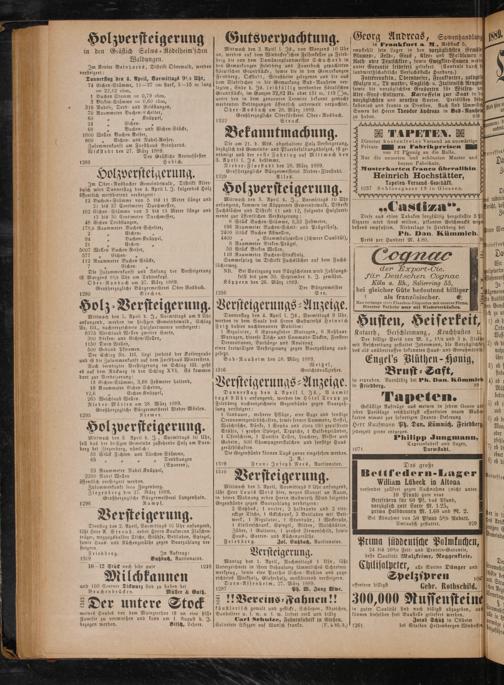 — 1 5 0 5 Holzversteigerung. Mittwoch den 3. April d. J., Vormittags 10 Uhr anfangend, kommen im Köpperner Gemeindewald, Distrikt Fuchslöcher und Distrikt 11 und 12, folgende Holzsorti— mente zur öffentlichen Versteigerung: 8 Stück Buchen-Stämme, 5,53 Festmeter, 196 Raummeter Buchen⸗Scheit- und Prüugelholz, 2400 Stück Buchen Astwellen, 4400„„ Stammbolzwellen(schwere Qualität), 8 Raummeter Birken-Prügel, 50 Stück Birken Wellen, 119 Raummeter Buchen-Stockholz. Sammelplatz im Distrikt Fuchslöcher auf dem Fuchs— löcherweg. NB. Bei Vorlegung von Bürgscheinen wird Zahlungs— frist bis zum 30. September d. J. gewährt. Köppern den 26. März 1889. Der Bürgermeister 1256 See.