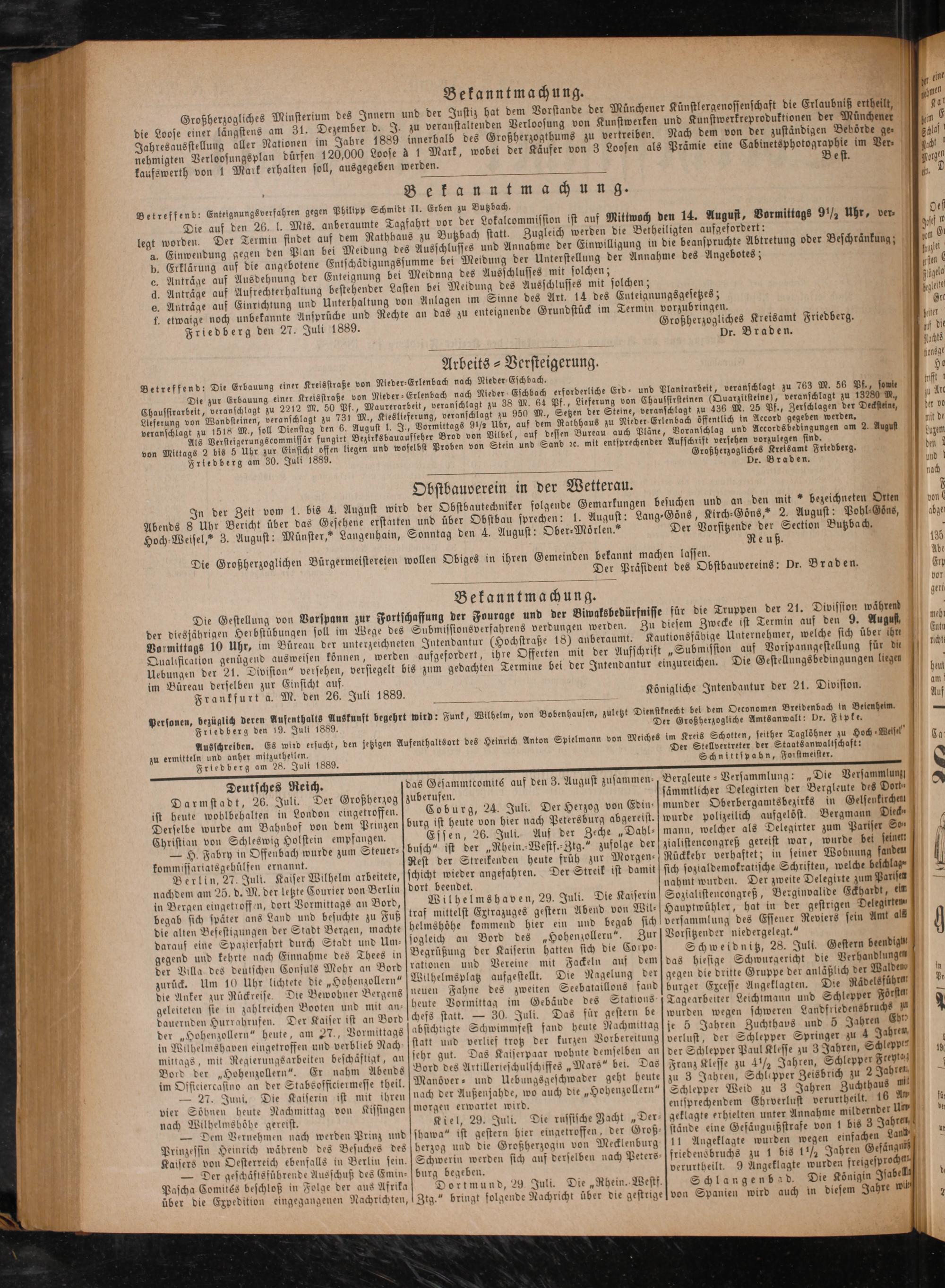 Ausschreiben. zu ermitteln und anher mitzutheilen. Friedberg am 28. Juli 1889.