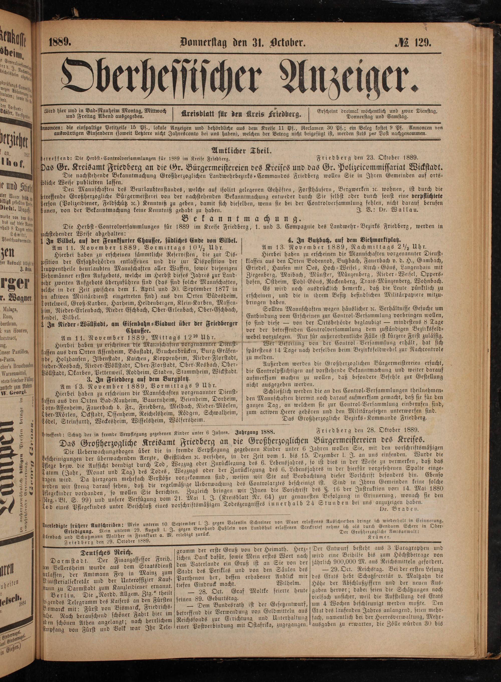 betreffend: Die Herbst-Controlversammlungen für 1889 im Kreise Friedberg. Friedberg den 23. Oktober 1889.
