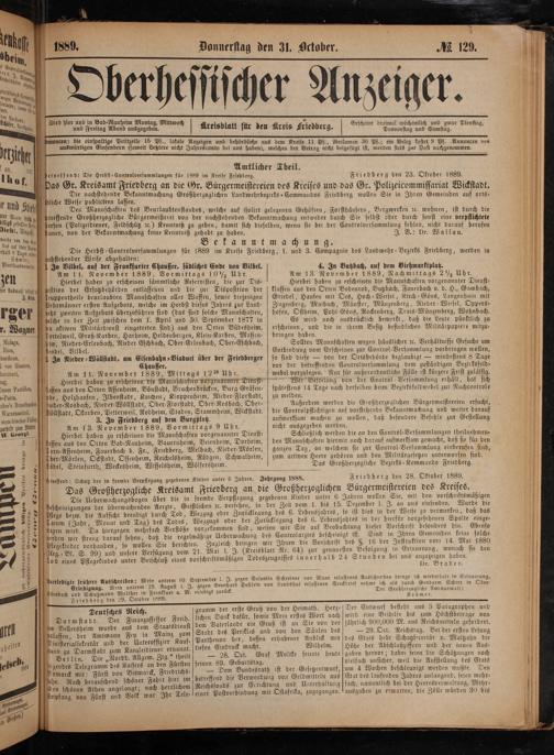 — 1 3 Erscheint dreimal wöchentlich und zwar Dienstag, Areisblatt für den Kreis Friedberg. Donnersiag und Samstäg. ncen: die einspaltige Petitzeile 15 Pf., lokale Anzeigen und behördliche aus dem Kreise 11 Pf., Reclamen 30 Pf.; ein Beleg kostet 9 Pf. Annoncen von a auswärtigen Einsendern(soweit Letztere nicht Jahresconto bei uns haben), welchen der Betrag nicht beigefügt ist, werden stets per Post nachgenommen.