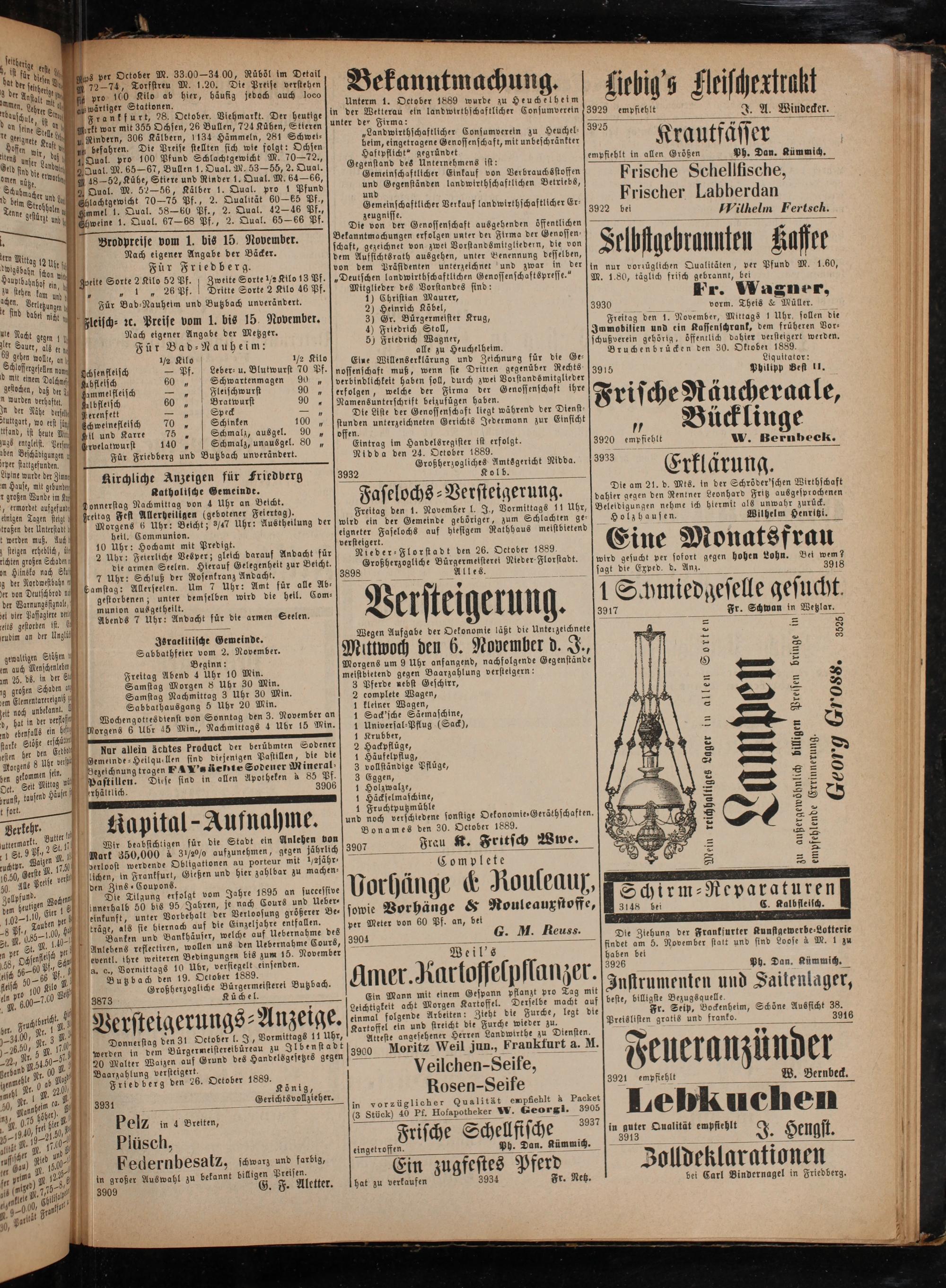 b, if 1 bat der ds per October M. 33.00—34.00, Rüböl im Detail* N* 72-74, Torfstreu M. 1.20. Die Preise verstehen t ch 5 nn Af lt 1 pro 100 Kilo ab hier, häufig jedoch auch loco L ann ma un 5 lt 10 5 kl e 1 a 100 ted. een 10 9 1 155 11 5 1 5 H e ale Ußrankfurt, 78. October. Viehmarkt. Der heutige r Wetterau ein landwirthschaftlicher Consumverein 3929 empfiehlt i 10 sen Sl 12 war mit 355 Ochsen, 26 Bullen, 724 Nahen Elfen unter der Firma: 5. N E eignete Kr t Rindern, 306 Kälbern, 1134 Hämmeln, 281 Schwei„Landwirthschaftlicher Consumverein zu Heuchel⸗ 3925 K* 1 wi 5 kala 995 15 9 91 sich wie folgt: Ochsen 0 N T rautfd er ö unse 4, Qual. pro un lachtgewicht M. 70— 72. aftpflicht“ gegründe 5 ü Gad 125 Suat. W. 65.—67, Bullen. Dual M. 5 50,2. Dual. Gezenfend des siaterchnens ie eee eee eee. e. onen nütze. 44852, Kühe, Stiere und Rinder 1. Qual. M. 64—66, Gemeinschaftlicher Einkauf von Verbrauchsstoffen Frische Schellfische Schubnacer 15 2 Qual. M. 5— 56, Kälber 1. Qual. pro 1 Pfund und Gegenständen landwirthschaftlichen Betriebs, 2 7 8 bun Sabel Eblachtgewicht 70—75 Pf., 2. Qualität 60—65 Pf., und 5 Frischer Labberdan e gestes Iumel 1. Qual. 58—60 Pf., 2. Qual. 42-46 Pf., Gemeinschaftlicher Verkauf landwirthschaftlicher Er— d. 8 zt und zeugnisse. 3922 bei Wilhelm Fertsch.