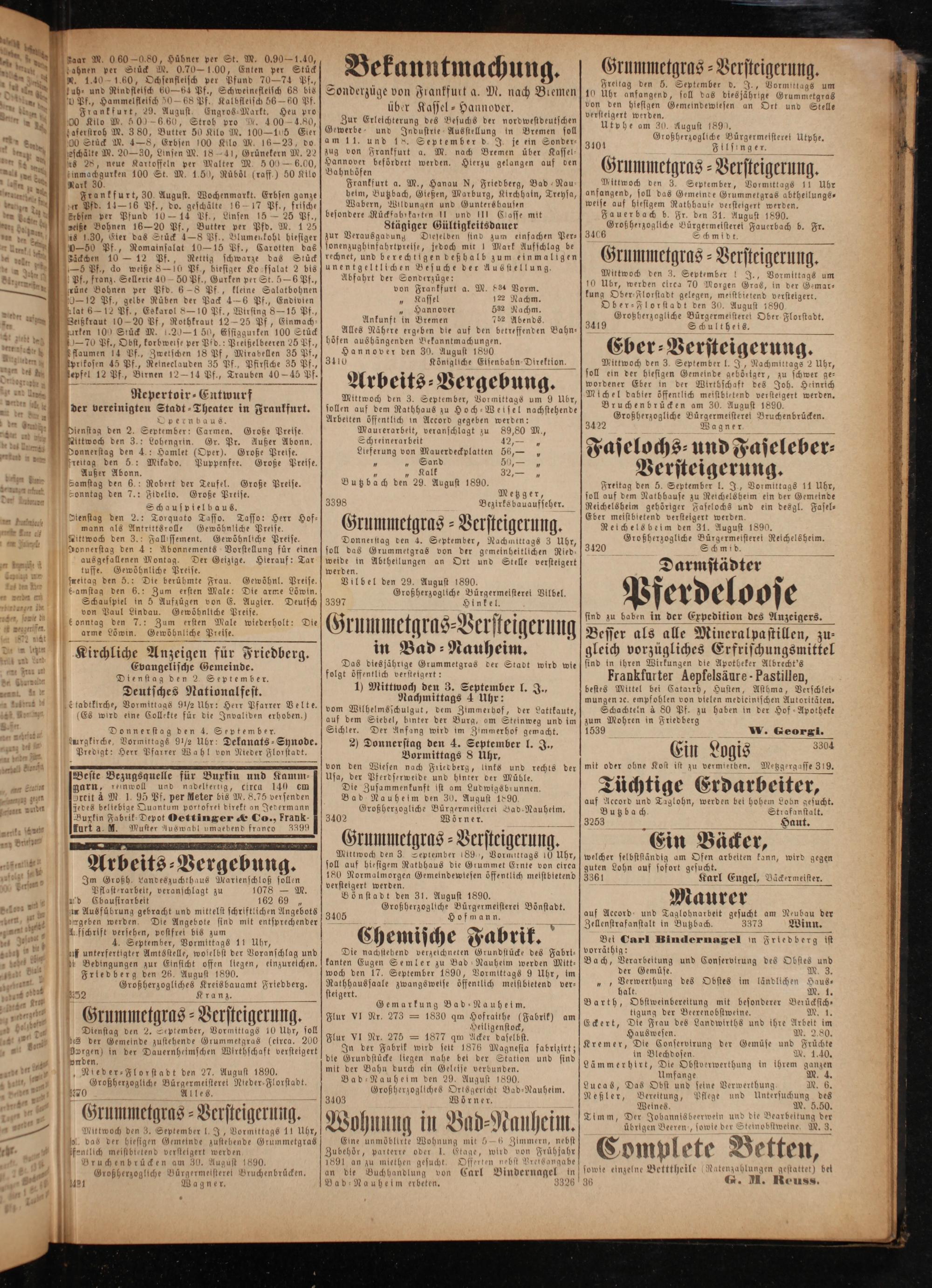 Das diesjährige Grummetgras der Stadt wird wie folgt öffentlich versteigert: 1) Mittwoch den 3. September l. J., Nachmittags 4 Uhr: vom Wilhelmsschulgut, dem Zimmerhof, der Lattkaute, auf dem Siebel, binter der Burg, am Steinweg und im Sichler. Der Anfang wird im Zimmerhof gemacht. 2) Donnerstag den 4. September l. J., Vormittags 8 Uhr, von den Wiesen nach Friedberg, links und rechts der Usa, der Pferdserweide und hinter der Mühle. Die Zusammenkunft ist am Ludwigsbrunnen. Bad Nauheim den 30. August 1890 Großherzogliche Bürgermeisterei Bad-Nauheim. 3402 Wörner.