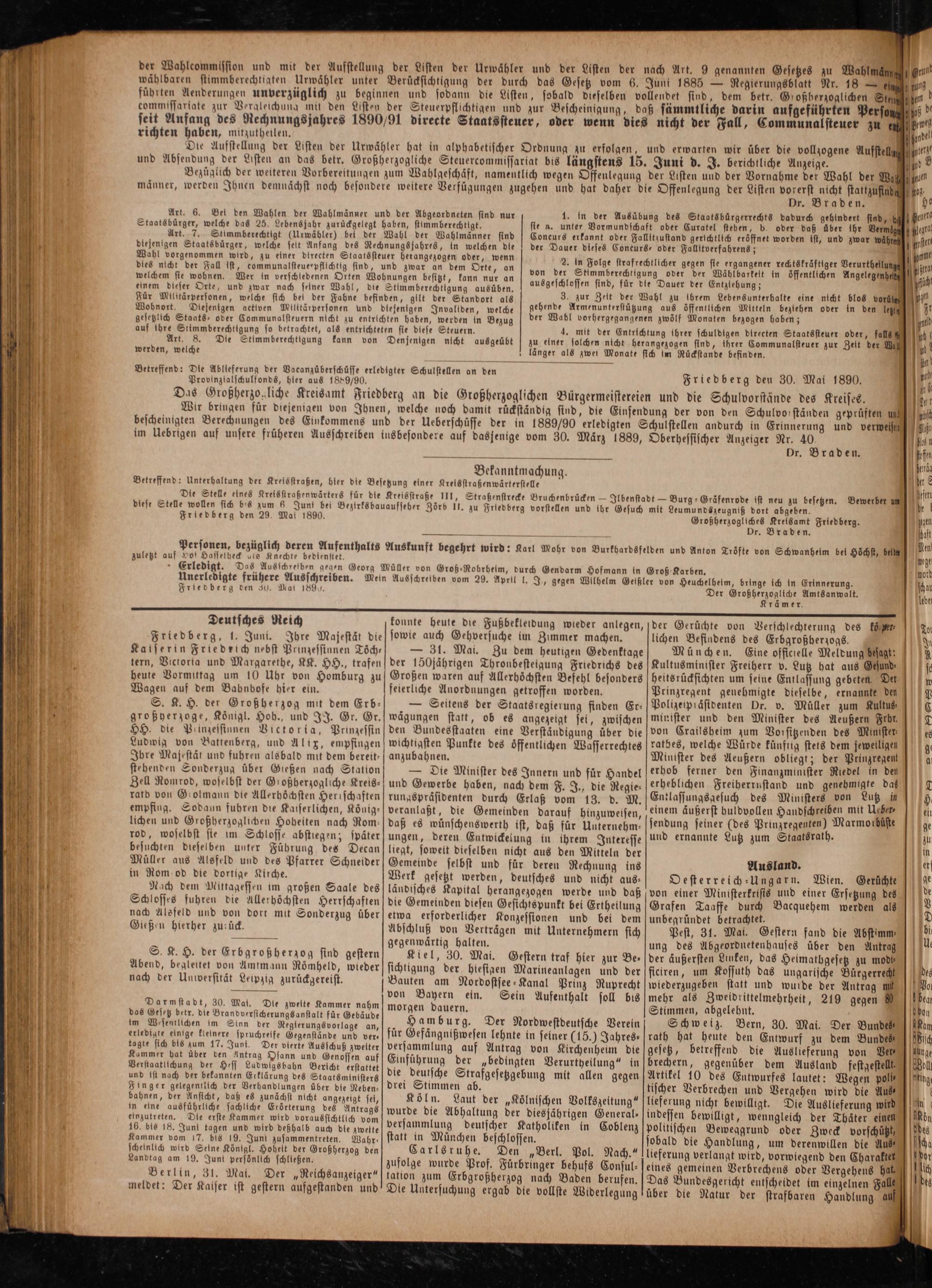 Friedberg, 1. Juni. Ihre Majfestät die Kalserin Friedeich nebst Prinzessinnen Töch— tern, Victoria und Margarethe, KK. HH., trafen heute Vormittag um 10 Uhr von Homburg zu Wagen auf dem Babnbofe hier ein.