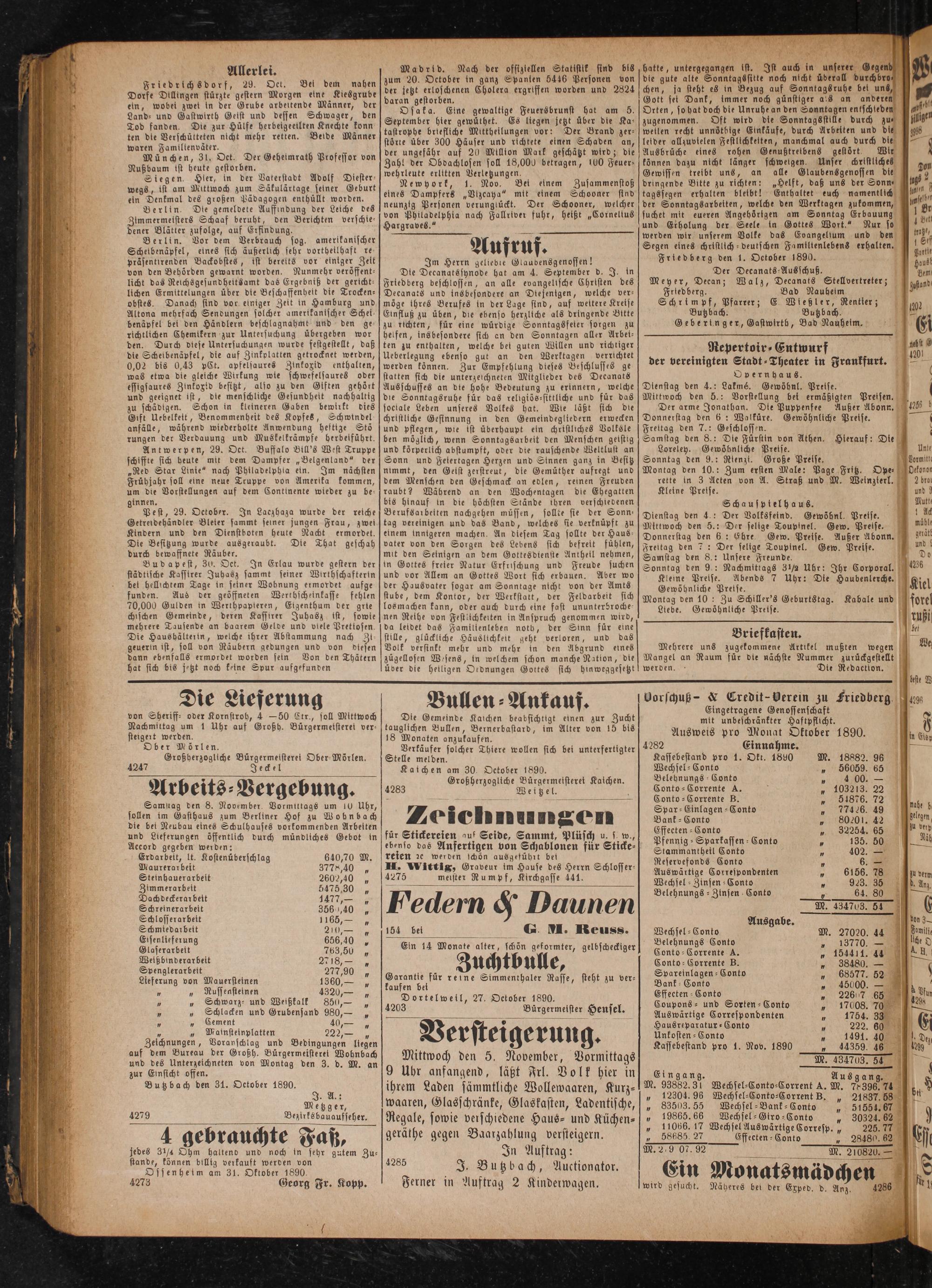 * Belehnungs Conto 4 4 00.— Conto-Corrente A.„ 103213, 22 Conto-Corrente B.„ 54876. 72 Spar⸗Einlagen-Conto„ 77426. 49 Bank⸗-Conto„ 80201. 42 Effecten-Conto„ 32254. 65 Pfennig-Sparkassen- Conto„ 135. 50 Stammantheil Conto 2 402.— Reservefonds Conto 5 6.— Auswärtige Correspondenten 5 6156. 78 Wechsel-Zinsen-Conto 1 923. 35 Belehnungs-Zinsen Conto 5 64. 80 M. 434703. 54 Ausgabe. Wechsel-Conto M. 27020. 44 Belehnungs Conto„ 13770.— Conto-Corrente A.„ 154411. 44 Conto-Corrente B.„ 38480.— Spareinlagen-Conto„ 68577. 52 Bank Conto„ 45000.— Effeeten-Conto„ 22607 65 Coupons- und Sorten-Conto„ 17008. 70% Auswärtige Correspondenten 10 1754. 33 Hausreparatur⸗Conto 5 222. 60 Unkosten-Conto 1 1491. 40 Kassebestand pro 1. Nov. 1890„ 44359. 46 M. 434703. 54 Eingang. Ausgang. M. 93882.31 Wechsel⸗Conto⸗Corrent A. M. 78396. 74 „ 12304. 96 Wechsel⸗Conto⸗Corrent B.„ 21837. 58 „ 83503.55 Wechsel-Bank-Conto„ 5554.67 „ 19865.66 Wechsel-Giro⸗Conto„ 30324. 62 „ 11066. 17 Wechsel Auswärtige Corresp.„ 225.77 „ 5868527 Effeeten-Conto„ 28480. 62 Wee e M. 210820.—