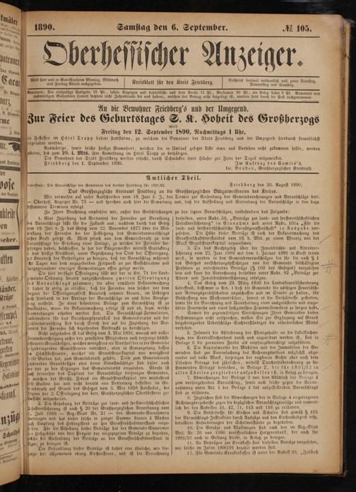 Freitag den 12. September 1890, Nachmittags 1 Uhr, in Festessen im Hötel Trapp dahier stattfinden, zu welchem die Bewohner der Stadt Friedberg und der Umgegend hierdurch freundlichst