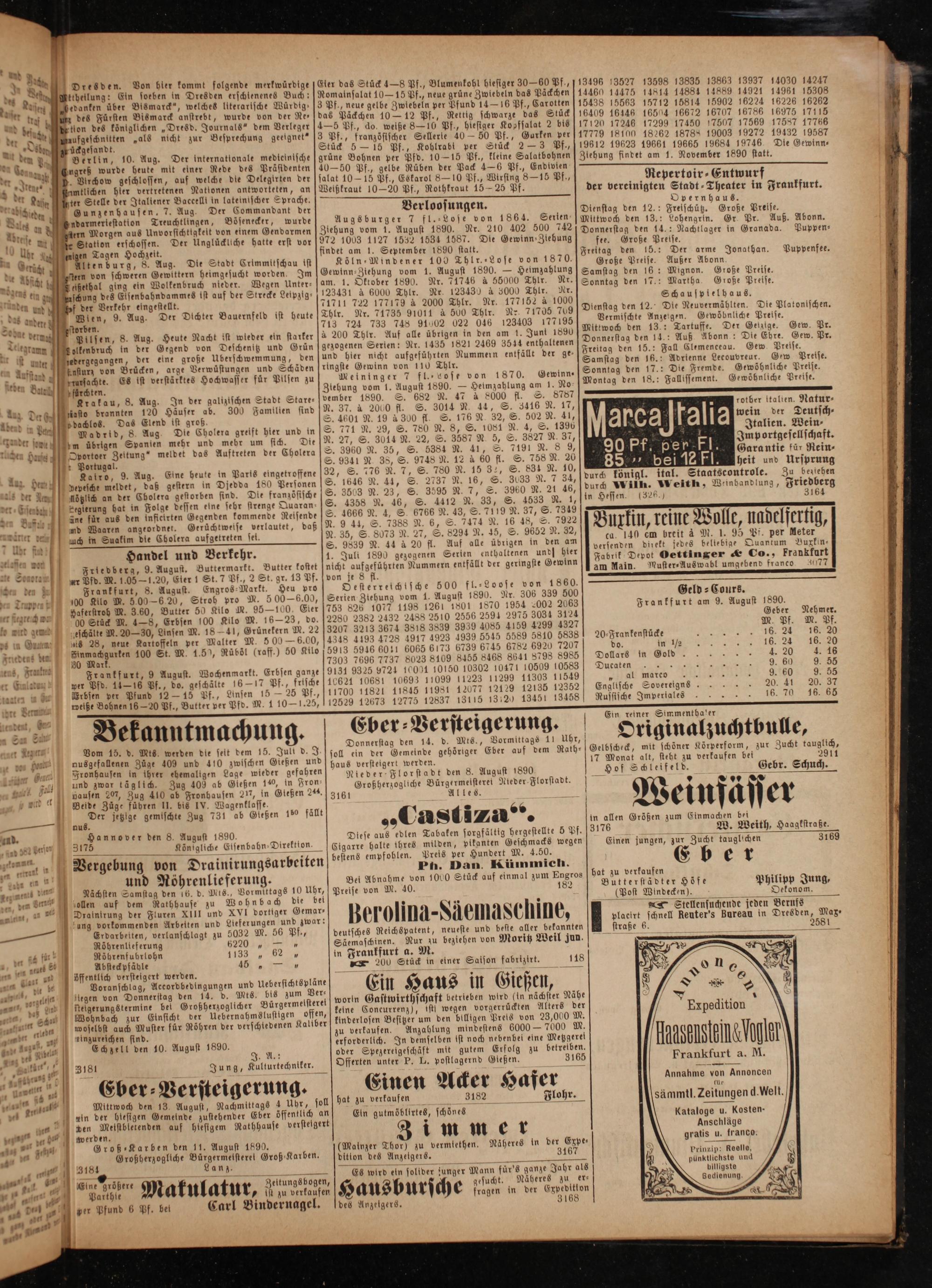 Fabrik Depot Oettinger& Co., Frankfurt am Main. Muster⸗Auswabl umgebend franco 2077 Geld⸗Cours. Frankfurt am 9. August 1890.